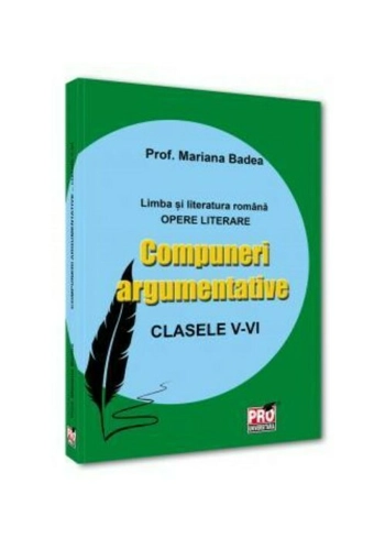 Intr-un demers menit sa clarifice si sa completeze cunostintele de literatura romana ale elevilor de clasele a V-a si a VI-a, doamna prof. MARIANA BADEA reuseste, in cea mai recenta carte a sa, sa ne ofere nu doar masura unei incredibile forte angrenate in slujba limbii romane, ci si "produsul literar" al unei indelungate si devotate cariere in invatamantul romanesc. Compuneri argumentative transforma studiul Limbii si literaturii romane pentru clasele V-VI intr-o experienta clara si accesibila. Spre deosebire de manualele clasice, care ofera mai mult intrebari decat explicatii, aceasta carte vine cu raspunsuri clare si utile: lamuriri pentru fiecare text literar, indicatii pas cu pas pentru caracterizarea personajelor, rezumate usor de inteles, dar si mici dictionare practice, care ii ajuta pe elevi sa descopere sensurile din spatele cuvintelor si autorilor. Este un ghid esential pentru elevi, parinti si profesori – simplu, complet si usor de folosit. Cu un bogat si remarcabil palmares editorial, doamna prof. MARIANA BADEA este, fara nicio indoiala, unul dintre autorii ale caror cuvinte sunt nu doar inspirat indreptate spre analiza si studiul explicativ al limbii si literaturii romane, ci si singulare prin amploarea si armonia cu care se transforma in texte.