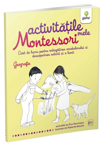 Cu ajutorul activităților propuse, vei putea îndruma copilul să descopere primele noțiuni de geografie (continentele, formele de relief etc.). CONȚINUT ACTIVITĂȚILE MELE MONTESSORI • GEOGRAFIE: - idei pentru experimente (de exemplu, cum să creezi un vulcan); - cartonașe de decupat; - elemente de construit; - planșă cu abțibilduri. În pedagogia Montessori, copilul este încurajat să observe, să facă experimente şi să lucreze cu mâinile pentru a înţelege lumea care îl înconjoară. Cele patru caiete de lucru concepute de Ève Hermann, preşedinta asociaţiei franceze EMA (Enseignement Montessori Aujourd’hui), propun activităţi cu ajutorul cărora copilul va descoperi primele noţiuni de geografie, botanică şi zoologie şi va înţelege conceptul de „timp”. Carteavine în ajutorul părinților cu o serie de sfaturi despre cum trebuie folosit caietul, astfel încât să fie valorificat la maximum. Principalele contribuții ale acestui caiet sunt acelea de a-i îmbogăți vocabularul copilului și de a-l ajuta să descopere natura și lumea. Astfel, copilul va deveni autonom, va reuși să se concentreze mai bine, să fie mai atent, să își dezvolte limbajul și perspicacitatea. Mai mult, micuțul își va spori creativitatea și motricitatea fină. Cartea face parte din colecția „Activitățile mele Montessori”, recomandată copiilor de 4-8 ani.