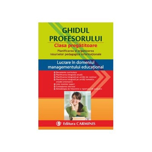 Contine: -Documente curriculare -Planificarea integrata anuala -Planificarea integrata pe unitati de continut -Planificarea integrata pe unitati tematice (Model orientativ) -Lista textelor-suport -Cunoasterea elevului -Metodologia de intocmire a raportului de evaluare Cuprins: Introducere Metodologia aplicarii planului-cadru Discipline la clasa pregatitoare - sugestii metodologice Schema orara Clasa pregatitoare Orarul corespunzator planificarii integrate pe unitati tematice Planificarea integrata anuala Planificarea integrata pe unitati de continut Model Planificarea pe (sub ) unitatea tematica"Prietenii apelor" (APA)- Saptamana 25 Oferta auxiliarelor - Clasa pregatitoare Editura Carminis Lista textelor-suport. Lista cantecelor si a jocurilor de miscare Cunoasterea elevului Metodologia de intocmire, completare si valorificare a raportului de evaluare