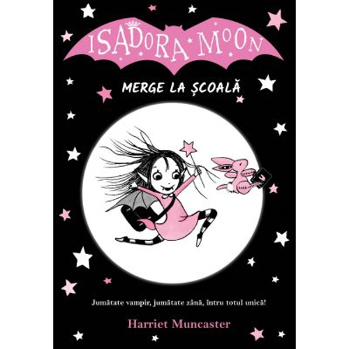 Mama ei este zana, tatal este vampir, iar ea este cate putin din amandoua! Indrageste noaptea, liliecii si costumul negru de balet, dar si soarele stralucitor, bagheta magica si il adora pe Iepurasul Roz. Cand vine vremea ca Isadora sa mearga la scoala, inca nu stie ce i se potriveste. Sa fie scoala de vampiri sau cea de zane? Aceasta sunt eu, Harriet Muncaster! Sunt autoarea si ilustratoarea cartii despre Isadora Moon. Da, chiar asa! Imi place orice e dragalas, orice e stralucitor si oricine este un visator.