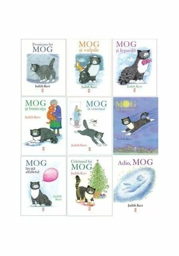 Varsta recomandata 4+ Pachetul de carti pentru copii Mog cuprinde titlurile: - Prostioara lui MOG; - MOG si vulpile; - MOG si Iepurila; - MOG si bunicuta; - MOG la veterinar; - MOG in intuneric; - MOG invata alfabetul; - Craciunul lui MOG; - Adio, MOG Prostioara lui MOG - Mog isi iubeste gradina, dar cumva se pare ca aceasta a disparut complet peste noapte. Ceea ce nu intelege Mog este ca obiectul falfaitor care se afla acum in locul gradinii ei este de fapt un cort amenajat pentru o expozitie de pisici. Mog se ascunde in casa, fara sa stie ca tot soiul de pisici de diverse marimi si culori defileaza, sperand sa iasa pe locul intai. Dar curiozitatea o invinge si Mog isi face o intrare spectaculoasa, castigand concursul gratie acrobatiilor ei. MOG si vulpile - Intr-o noapte tarziu, Mog da nas in nas cu niste vulpi care fac un adevarat dezastru in bucatarie. Dar cine va curata in urma lor? Ce va face Mog? MOG si Iepurila - Intr-o zi, Mog primeste un cadou. Este un iepuras de plus, pe nume Iepurila, care curand va deveni lucrul sau cel mai drag. De aceea, cand dispare Iepurila, dispare si Mog! MOG si bunicuta - Pentru ca familia Thomas a plecat in vacanta, Mog a ramas la bunica. Parea ca totul va fi bine, dar nimeni nu i-a spus lui Mog despre Tibbles… MOG la veterinar - Intr-o zi, Mog incerca sa prinda un fluture cand, deodata, s-a intamplat ceva cu labuta ei. „Va trebui sa o vada un veterinar", a zis doamna Thomas. Dar Mog nu poate sa sufere sa mearga la veterinar si, inainte ca acesta sa apuce sa o consulte, pisicuta provoaca mare taraboi in cabinetul medical… Judith Kerr este autoarea si ilustratoarea indragitelor carti pentru copii din seria Mog si Tigrul care a venit la ceai. A mai scris trei romane inspirate din propria copilarie, printre care When Hitler Stole Pink Rabbit. Cartile ei pentru copii s-au vandut in peste 9 milioane de exemplare si au devenit clasice. MOG in intuneric - Mog statea in intuneric. Mog se gandea in intuneric. Mog nu voia sa fie in intuneric... Dar cine mai era acolo, in intuneric? Judith Kerr este autoarea si ilustratoarea indragitelor carti pentru copii din seria Mog si Tigrul care a venit la ceai. A mai scris trei romane inspirate din propria copilarie, printre care When Hitler Stole Pink Rabbit. Cartile ei pentru copii s-au vandut in peste 5 milioane de exemplare si au devenit clasice. MOG invata alfabetul - Sa ne distram alaturi de Mog! Pentru adorabila pisica buclucasa, petrecerea pentru ziua de nastere a lui Debbie inseamna o aventura printre literele alfabetului! De-a lungul acestei aventuri, Mog se intalneste cu Dragoni in intuneric si cu un Jaguar caruia ii place Jeleul. M vine de la Mog, dar, spre uimirea simpaticei pisici, si de la Marele Soarece-Monstru din visul ei. Craciunul lui MOG - In casa e o forfota ciudata: zgomote noi, mirosuri noi si…incotro merge bradul acela? Tulburata de toate aceste activitati neobisnuite, Mog se refugiaza pe acoperisul casei si sta acolo… pana cand coboara pe neasteptate cu o bufnitura! ADIO, Mog - Mog continua sa vegheze asupra familiei Thomas – toti sunt foarte tristi si ii duc dorul. Asa ca Mog se intreaba cum se vor descurca fara ea. O vreme nu se intampla nimic… apoi brusc, intr-o zi, Mog observa un pui de pisica in casa. Pisoiului ii e frica de orice, iar lui Mog i se pare ca e tare prost. Dar apoi isi da seama ca pisoiul cel speriat nu stie sa se joace si are nevoie doar de „putin ajutor". Asa ca il impinge in bratele lui Debbie, unde acesta descopera ca se simte foarte bine si ca ii place sa fie mangaiat si gadilat. Multumita, Mog zboara sus de tot, pana la soare…