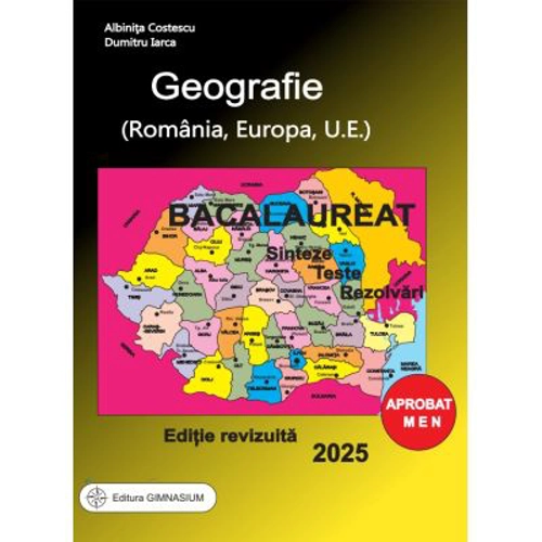 Lucrarea a fost evaluata aprobata pentru a fi utilizata in unitatile de invatamant preunivcrsitar de MEN prin ORDINUL 3022/08 01 2018 Lucrarea este structurata in doua parti: 1. Sintezele continuturilor si evaluari la fiecare continut. 2. Teste finale si raspunsuri (100 teste si raspunsuri). In comparatie cu vechea lucrare sintezele temelor din programa de bacalaureat sunt mult imbunatatite continand si harti care sa faciliteze incadrarea in spatiu a informatiilor si o mai buna fixare a cunostintelor. Hartile au fost realizate in bune conditii grafice si contin numai informatiile solicitate de programa. De asemenea au fost incluse teste la finalul fiecarui continut care sa asigure o autoevaluare a performantelor fiecarui elev, si sa ofere informatii pentru organizarea, in continuare, a procesului de invatare. Lucrarea Geografie (Romania, Europa, Uniunea. Europeana), sinteze, teste si rezolvari^ este un auxiliar didactic destinat pregatirii elevilor pentru examenul de bacalaureat. Este o editie imbunatatita a lucrarii anterioare elaborate de autori. Prezenta lucrare reprezinta un util instrument de lucru pentru absolventii de liceu care aleg sa sustina examenul de bacalaureat la geografie dar si pentru cadrele didactice. Ea respecta programa de geografie - clasa a XII-a, precum si Programa si modelele de subiecte pentru examenul de bacalaureat. Autorii au gandit si elaborat aceasta lucrare pentru a permite o invatare pe parcursul intregului an scolar. Ea cuprinde, in prima parte, continuturile din programa de bacalaureat precum si teste la finalul fiecarui continut care asigura o autoevaluare a performantelor fiecarui elev si care sa ofere informatii pentru organizarea procesului de A? invatare. In partea a doua contine 100 de teste finale cu rezolvari ale caror intrebari cuprind practic toata informatia din continuturile prevazute de programa. Pentru asigurarea reusitei la examenul de bacalaureat recomandam candidatilor, mai intai, insusirea fiecarui continut si a exercitiului de evaluare si apoi rezolvarea testelor finale. in cazul in care se constata erori ale elevului m rezolvarea testelor finale se impune reparcurgerea continuturilor. Cu convingerea ca insusirea continuturilor si rezolvarea testelor din aceasta lucrare pot asigura reusita la examen, va uram mult succes. Cuprins: A. EUROPA SI ROMANIA - ELEMENTE GEOGRAFICE DE BAZA Spatiul romanesc si spatiul European Evaluare Elemente fizico-geografice definitorii ale Europei si ale Romaniei Relieful Euopei Evaluare Relieful Romaniei Evaluare Clima Europei Evaluare Clima Romaniei Evaluare Hidrografia Europei Hidrografia Romaniei Evaluare Invelisul biopedageografic Evaluare Resurse naturale Elemente de geografie umana ale Europei si ale Romaniei Harta politica a Europei si Romaniei Evaluare Sistemul de orase al Europei si Romaniei Evaluare Activitati economice (Europa si Romania) Tarile vecine Romaniei B. ROMANIA SI UNIUNEA EUROPEANA Formarea Uniunii Europene si evolutia integrarii europene. Caracteristici geografice, politice si economice actuale ale Uniunii Europene Statele Uniunii Europene Teste finale Bibliografie