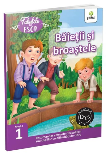 Ce ție nu-ți place altuia nu-i face! Descoperă cum au scăpat broaștele dintr-un lac de jocul periculos al unor copii plictisiți. La sfârșitul cărții găsești exerciții de rezolvat după lectură, precum și un mic dicționar. Fabulele scrise de Esop (620-564 î.Hr.) reprezintă o colecție de povești cu un fir narativ simplu, din care se desprinde cu ușurință o morală, ceea ce le face foarte potrivite ca prime lecturi ale cititorilor începători. Datorită fontului special Dyslexie, sunt recomandate și copiilor mai mari care citesc cu dificultate. Alte titluri pentru Esop (autor): Fabulele lui Esop. Povești mereu nemuritoare (Vol.1) (2016) , Fabulele lui Esop. Povești mereu nemuritoare (Vol.2) (2016) , Esop. Fabule (repovestire) (2022) , Șoricelul de țară și Șoricelul de oraș (2022) , Tăietorul de lemne cinstit (2021) , Furnica și porumbița (2021) , Lăptăreasa (2021) , Lupul în blană de oaie (2021) , Ciobănașul mincinos (2021) , Corbul și vulpea (2021) ,