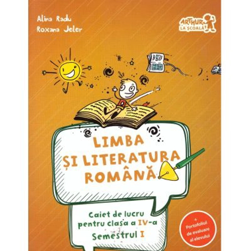 Caiet de lucru la Limba si literatura romana conform programei pentru clasa a IV-a, semestrul I Prezentul caiet de lucrul este auxiliarul manualului de Limba si literatura romana. Clasa a IV-a al editurii Art, autori: Alina Radu, Roxana Jeler, manual aprobat prin OMENCS nr. 5471/12. 10. 2016 Este cel mai potrivit auxiliar pentru ora de limba si literatura romana, deoarece: - Completeaza perfect manualul editurii Art, urmand structura acestuia si suplimentand oferta de exercitii a fiecarei lectii cu numeroase sarcini de redactare ; - Este un excelent caiet de lucru, preazut cu generoase spatii de redactare; - Reprezinta o complexa culegere de exercitii, prin multitudinea si diversitatea aplicatiilor de gramatica si de ortografie/punctuatie propuse - Cuprinde texte-suport ce reprezinta universul copilului de astazi si cultiva interesul pentru lectura ; - Ofera exercitii utile pentru formarea unor competente indispensabile a omului educat, suferand contexte de invatare specifice vietii cotidiente din secolul al XXI-lea; - Este conceput in conformitate cu cele mai noi abordari din didactica actuala; - Este însoțit de Portofoliul de evaluare al elevului, care cuprinde testele sumative și testele de recapitulare finala. Probele de evaluare sunt concepute dupa modelul Evaluarii Nationale de la clasa a IV-a si pot fi decupate din portofoliu pentru a fi administrate elevilor la prima vedere. Toate testele sunt insotite de descriptori de performanta.
