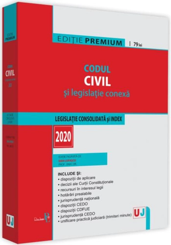 Include: ● textul actualizat al Codului (iulie 2020), însoțit de un index detaliat ● dispoziții de aplicare ● decizii ale Curții Constituționale ● recursuri în interesul legii ● hotărâri prealabile ● jurisprudența națională ● dispoziții CEDO ● dispoziții CDFUE ● jurisprudența CEDO ● unificare practică judiciară (trimiteri minute) ● numeroase acte normative conexe (integrale sau în extras) și indexul acestora Îngrijită de prof. univ. dr. Dan Lupașcu, culegerea Codul civil și legislație conexă 2020. Ediție PREMIUM continuă seria edițiilor PREMIUM din acest an. Edițiile PREMIUM sunt tipărite pe hârtie albă de calitate superioară, ideală pentru adnotările necesare în activitatea didactică și practică, oferă un conținut consolidat și îmbogățit constând în numeroase acte normative, extrase atent selectate și jurisprudența relevanță, națională și europeană, la care se adaugă diverse alte informații utile, structurate profesionist și evidențiate adecvat prin grafică specială. Seria PREMIUM se adresează practicienilor, teoreticienilor, doctoranzilor, masteranzilor, studenților. Alte titluri pentru DanLupaşcu (ingrijita-de): Codul civil și legislație conexă 2023. Ediție PREMIUM (2023) , Codul de procedura civilă: ianuarie 2024 (2024) , Codul civil. Legislație consolidată și index (septembrie 2023) (2023) , Codul de procedura civilă: septembrie 2023 (2023) , Codul civil. Legislație consolidată și index (mai 2023) (2023) , Codul civil și Codul de procedură civilă (octombrie 2023) (2023) , Codul civil și Codul de procedură civilă: martie 2023 (2023) , Codul de procedură civilă Septembrie 2023 (ediție spiralată) (2023) , Codul de procedură civilă ianuarie 2023 (ediție spiralată) (2023) , Codul civil. Ediția a 9-a actualizată la 15 mai 2023 (2023) ,