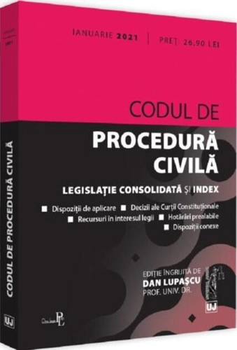 Ediția a 16-a (revizuită) a lucrării, Codul de procedură civilă: ianuarie 2023, tipărită pe hârtie albă de calitate superioară și îngrijită de prof. univ. dr. Dan Lupașcu, conține textul Codului de procedură civilă actualizat, articolele Codului fiind însoțite, acolo unde este cazul, de dispoziții tranzitorii, de aplicare sau conexe, necesare unei depline înțelegeri a reglementării. Volumul Codul de procedură civilă: ianuarie 2023 cuprinde și: decizii ale Curții Constituționale; recursuri în interesul legii și hotărâri prealabile (inclusiv unele recente, nepublicate încă în Monitorul Oficial); Legea nr. 140/2022 privind unele măsuri de ocrotire pentru persoanele cu dizabilități intelectuale și psihosociale și modificarea și completarea unor acte normative (extras); Legea nr. 172/2022 pentru ratificarea Protocolului nr. 16 la Convenția pentru apărarea drepturilor omului și a libertăților fundamentale, adoptat la Strasbourg la 2 octombrie 2013 și semnat de România la Strasbourg la 14 octombrie 2014; Legea nr. 173/2022 pentru adoptarea unor măsuri necesare punerii în aplicare a Protocolului nr. 16 la Convenția pentru apărarea drepturilor omului și a libertăților fundamentale, adoptat la Strasbourg la 2 octombrie 2013 și semnat de România la Strasbourg la 14 octombrie 2014 (extras); Legea nr. 220/2022 privind valorificarea adaptată a unor măsuri dovedite benefice pentru instituțiile din domeniul justiției instituite pe perioada stării de alertă declarate în vederea prevenirii și combaterii efectelor pandemiei de COVID-19 (extras). Indexul plasat la finalul Codului facilitează utilizarea acestuia, indicând sediul materiei pentru diverse instituții importante în domeniul procedurii civile și asigurând o căutare rapidă a cuvintelor-cheie corespunzătoare. Lucrarea Codul de procedură civilă: ianuarie 2023 este destinată nu doar practicienilor și studenților, ci și teoreticienilor interesați de acest domeniu. Alte titluri pentru DanLupaşcu (ingrijita-de): Codul civil și legislație conexă 2023. Ediție PREMIUM (2023) , Codul de procedura civilă: ianuarie 2024 (2024) , Codul civil. Legislație consolidată și index (septembrie 2023) (2023) , Codul de procedura civilă: septembrie 2023 (2023) , Codul civil. Legislație consolidată și index (mai 2023) (2023) , Codul civil și Codul de procedură civilă (octombrie 2023) (2023) , Codul civil și Codul de procedură civilă: martie 2023 (2023) , Codul de procedură civilă Septembrie 2023 (ediție spiralată) (2023) , Codul de procedură civilă ianuarie 2023 (ediție spiralată) (2023) , Codul civil. Ediția a 9-a actualizată la 15 mai 2023 (2023) ,