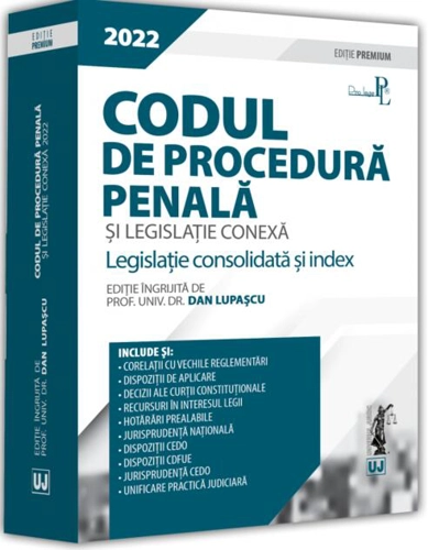 Include: corelații cu vechile reglementări textul actualizat al Codului (august 2022), însoțit de un index detaliat dispoziții de aplicare decizii ale Curții Constituționale recursuri în interesul legii hotărâri prealabile jurisprudență națională dispoziții CEDO dispoziții CDFUE jurisprudență CEDO unificare practică judiciară (trimiteri minute) numeroase acte normative conexe (integrale sau în extras) și indexul acestora Îngrijită de prof. univ. dr. Dan Lupașcu, culegerea Codul de procedură penală și legislație conexă 2022. Ediție PREMIUM închide seria edițiilor PREMIUM din acest an. Edițiile PREMIUM beneficiază de copertă lăcuită selectiv și sunt tipărite pe hârtie albă de calitate superioară, ideală pentru adnotările necesare în activitatea didactică și practică. Totodată, oferă un conținut consolidat și îmbogățit constând în numeroase acte normative și extrase atent selectate, la care se adaugă informații utile, structurate profesionist și evidențiate adecvat prin grafică și cromatică speciale. Seria se adresează practicienilor, teoreticienilor, doctoranzilor, masteranzilor, studenților. Alte titluri pentru DanLupaşcu (ingrijita-de): Codul civil și legislație conexă 2023. Ediție PREMIUM (2023) , Codul de procedura civilă: ianuarie 2024 (2024) , Codul civil. Legislație consolidată și index (septembrie 2023) (2023) , Codul de procedura civilă: septembrie 2023 (2023) , Codul civil. Legislație consolidată și index (mai 2023) (2023) , Codul civil și Codul de procedură civilă (octombrie 2023) (2023) , Codul civil și Codul de procedură civilă: martie 2023 (2023) , Codul de procedură civilă Septembrie 2023 (ediție spiralată) (2023) , Codul de procedură civilă ianuarie 2023 (ediție spiralată) (2023) , Codul civil. Ediția a 9-a actualizată la 15 mai 2023 (2023) ,