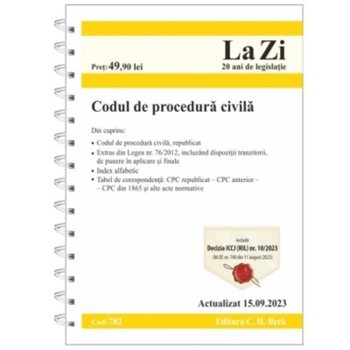 De la ultima editie a lucrarii a intervenit o modificare legislativa relevanta, respectiv actualizarile aduse prin Legea nr. 57/2023 pentru modificarea Legii nr. 134/2010 privind Codul de procedura civila (M. Of. nr. 186 din 6 martie 2023). Totodata, au fost incluse in culegere si Deciziile Curtii Constitutionale si ale Inaltei Curti de Casatie si Justitie cu incidenta in domeniu; de pilda, Decizia ICCJ (RIL) nr. 10/2023 (M. Of. nr. 740 din 11 august 2023). Din cuprins Legea nr. 134/2010 privind Codul de procedura civila, republicata Legea nr. 76/2012 pentru punerea in aplicare a Legii nr. 134/2010 (extras) Legea nr. 2/2013 privind unele masuri pentru degrevarea instantelor judecatoresti (extras) Tabel de corespondente CPC republicat – CPC anterior – CPC din 1865 si alte acte normative Index alfabetic Puncte forte dispozitiile de punere in aplicare si cele tranzitorii sunt inserate direct sub articolele din Cod la care se refera note utile, trimiteri la doctrina de specialitate istoricul actelor normative Codul este tiparit pe hartie alba, de calitate superioara, in format A5 legat cu spira, pentru o utilizare mai facila index alfabetic detaliat Recomandari Codul de procedura civila. Comentariu pe articole. Editia 3 Institutii judiciare. Editia 2 Codul de procedura civila. Comentarii si explicatii