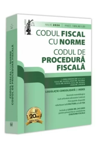 CODUL FISCAL CU NORME SI CODUL DE PROCEDURA FISCALA: IULIE 2024 Cu NOILE MODIFICARI aduse prin: O.U.G. NR. 59/2024 LEGEA NR. 192/2024 O.U.G. NR. 70/2024 O.U.G. NR. 78/2024 LEGEA NR. 204/2024 Normele metodologice (sub articolele/alineatele Codului) Principalele dispozitii referitoare la E-FACTURA si la E-TVA Include si LEGEA NR. 241/2005 pentru prevenirea si combaterea EVAZIUNII FISCALE Editia a 8-a (revizuita) a lucrarii, Codul fiscal cu Norme si Codul de procedura fiscala: iulie 2024, tiparita pe hartie alba de calitate superioara, include noile modificari aduse prin: O.U.G. nr. 59/2024 (M. Of. nr. 534 din 7 iunie 2024); Legea nr. 192/2024 (M. Of. nr. 576 din 20 iunie 2024); O.U.G. nr. 70/2024 (M. Of. nr. 582 din 21 iunie 2024); O.U.G. nr. 78/2024 (M. Of. nr. 596 din 26 iunie 2024); Legea nr. 204/2024 (M. Of. nr. 600 din 27 iunie 2024). Sub articolele/alineatele celor doua Coduri, se regasesc (acolo unde este cazul): decizii ale Curtii Constitutionale; recursuri in interesul legii; hotarari prealabile; numeroase dispozitii conexe deosebit de utile. Indexul plasat la finalul fiecarui Cod indica sediul materiei pentru diverse institutii de drept importante in domeniu, asigurand o cautare rapida a cuvintelor-cheie aferente. Lucrarea cuprinde si urmatoarele acte normative (integrale sau in extras) de larg interes in domeniu: Legea nr. 241/2005 pentru prevenirea si combaterea evaziunii fiscale; O.U.G. nr. 120/2021 privind administrarea, functionarea si implementarea sistemului national privind factura electronica RO e-Factura si factura electronica in Romania; Legea nr. 296/2023 privind unele masuri fiscal-bugetare pentru asigurarea sustenabilitatii financiare a Romaniei pe termen lung; O.U.G. nr. 70/2024 privind unele masuri de implementare si utilizare a decontului precompletat RO e-TVA si valorificarea datelor si informatiilor prin implementarea unui sistem de guvernanta specific, precum si alte masuri fiscale. Culegerea Codul fiscal cu Norme si Codul de procedura fiscala: iulie 2024 se adreseaza, astfel, practicienilor, teoreticienilor si studentilor, economistilor, contabililor, auditorilor financiari si consultantilor fiscali, functionarilor angajati in institutii de profil, antreprenorilor, tuturor celor interesati de finante si fiscalitate, dar si publicului larg. PRO LEGE – O colecție necesara oricarui jurist: - reuneste intre copertele fiecarei culegeri informatii esentiale si extinse din domeniul abordat, inlesnind astfel utilizatorului activitatea de cercetare, reducand semnificativ si eficient timpul dedicat acesteia; - prezinta pachete de acte normative consolidate, atent selectate in vederea acoperirii domeniului vizat, imbogatite cu note si referinte utile, structurate si evidentiate profesionist si menite a facilita intelegerea vointei si a intentiilor legiuitorului (prin semnalarea si/sau prin prezentarea unor corelatii ori a unor spete relevante, in unele cazuri prin oferirea unor lamuriri punctuale etc.); - este tiparita pe hartie alba de calitate superioara, ideala pentru adnotarile necesare in activitatea didactica si practica; - seria PREMIUM din cadrul colectiei PRO LEGE include un vast material informativ suplimentar (dupa caz, jurisprudenta europeana, mai multa jurisprudenta nationala si mai multe legi conexe integrale sau in extras, varii adnotari etc.); - fiecare culegere in parte constituie, practic, un instrument juridic complex, indispensabil activitatii de zi cu zi in cadrul domeniului caruia ii este dedicata si pe care il reprezinta, organizand unitar informatiile necesare unei bune cunoasteri a domeniului respectiv. COORDONAREA GENERALA a Colecției PRO LEGE este asigurata de consilier juridic Oliviu Craznic.