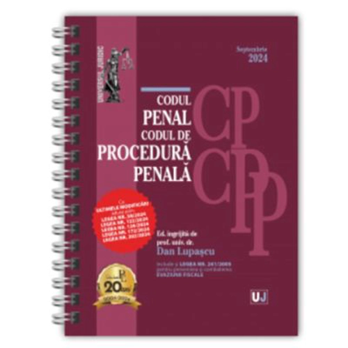 Lucrarea Codul penal si Codul de procedura penala Septembrie 2024 (editie spiralata), tiparita pe hartie alba de calitate superioara si ingrijita de prof. univ. dr. Dan Lupascu, include ultimele modificari aduse prin: Legea nr. 58/2024; Legea nr. 122/2024; Legea nr. 126/2024; Legea nr. 172/2024; Legea nr. 202/2024. Sub articolele celor doua Coduri, se regasesc (acolo unde este cazul): corelatii cu reglementarile anterioare; dispozitii de aplicare; decizii ale Curtii Constitutionale; recursuri in interesul legii; hotarari prealabile; numeroase dispozitii conexe si referinte legislative deosebit de utile. Indexul plasat la finalul fiecarui Cod indica sediul materiei pentru diverse institutii importante in domeniul penal, respectiv in domeniul procedurii penale, asigurand o cautare rapida a cuvintelor-cheie aferente. Lucrarea include, in partea finala, si diverse acte normative (integrale sau in extras) de larg interes in domeniu: Legea nr. 241/2005 pentru prevenirea si combaterea evaziunii fiscale (cu recentele modificari), Legea nr. 146/2021 privind monitorizarea electronica in cadrul unor proceduri judiciare si executional penale (cu noile modificari), Legea nr. 26/2024 privind ordinul de protectie (recent intrata in vigoare) s. a. Culegerea Codul penal si Codul de procedura penala Septembrie 2024 (editie spiralata) este destinata magistratilor, politistilor, avocatilor, altor categorii de practicieni, dar si teoreticienilor si studentilor.