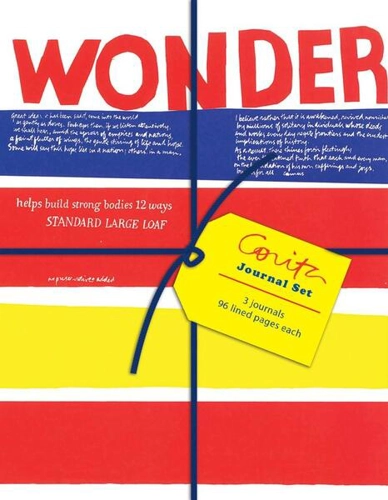 Renowned artist Corita Kent created prints that remixed recognisable advertisements into spiritual messages. This set of three journals, each with 96 lined pages, features vibrant images from a series centered on a famous bread brand. Celebrate the art of this unique nun-turned-pop artist with the Corita Kent Petite Journal Set. • 3 journals, 96 lined pages (each) • Trim size (each): 4.75 x 6 inches • String closure + tag • Polybag packaging