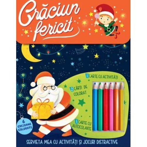 CUPRINDE: Sa ne jucam! Craciun colorat: carte de activitati, 16 pagini Craciun de poveste: carte de colorat cu versuri, 16 pagini Distractie de Craciun: carte de colorat cu versuri, 16 pagini Craciun cu prietenii: carte cu autocolante, 5 pagini