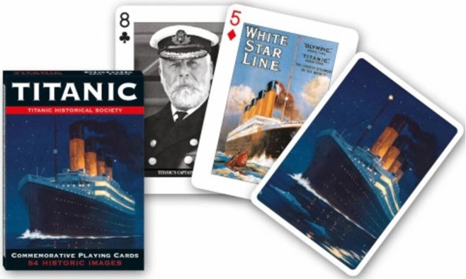 Pachet cu 55 de cărți de joc de colecție (52 de cărți de joc + 2 jokeri + o carte descriptivă), fiecare carte de joc având ca background câte o fotografie sau un afiș cu referire la marea catastrofă navală care a dus la scufundarea pachebotului Titanic la 15 aprilie 1912. Veți vedea imagini de arhivă impresionante cu Titanicul înainte de scufundare, dar și cu oameni care au fost victime sau supraviețuitori ai acestei mari catastrofe navale. Cărțile de joc de colecție cu tema „Titanic” pot constitui un cadou inspirat pentru cei pasionați de joc dar și de istorie navală. Cărți de joc produse la Viena de Piatnik.