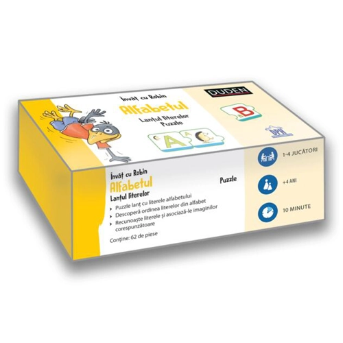 Lanțul literelor - Puzzle - Puzzle lanț cu literele alfabetului - Descoperă ordinea literelor din alfabet - Recunoaște literele și asociază-le imaginilor corespunzătoare Conține: 62 de piese
