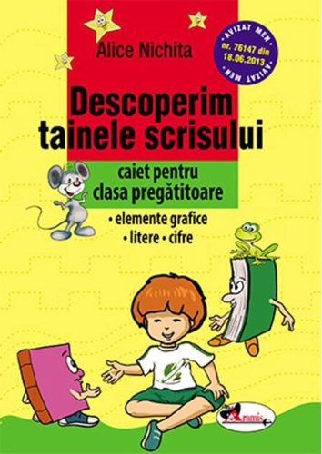 Caietul Descoperim tainele scrisului asigură: - un start bun în învățarea scrisului - un suport de exersare - un suport de consolidare, de evaluare și de sprijin Considerând că scrierea se naște în și prin perfecționarea grafismului, vă propunem un caiet foarte util în această etapă de adaptare la viața școlară și socială. Caietul cuprinde: - elemente grafice - litere - cifre Alte titluri pentru AliceNichita (autor): Elemente grafice cu Riţa Gărgăriţa şi Greieraşul Albastru, caiet pentru grupa mare 5-6 ani (2023) , Domeniul Om și societate. Caiet pentru 3-4 ani (2016) , Domeniul Om și societate. Caiet pentru 4-5 ani (2016) , Domeniul Om și societate. Caiet pentru 5-6 ani (2016) , Evaluarea finală în grădiniță 4-5 ani (2023) , Evaluarea finală în grădiniță 3-4 ani (2017) , Evaluarea finală în grădiniță 5-6 ani (2023) , Domeniul om și societate. Caiet de activități practice 4-5 ani (2018) , Domeniul om și societate. Caiet de activități practice 5-6 ani (2018) , Domeniul științe. Caiet de activități matematice 5-6 ani (2018) ,