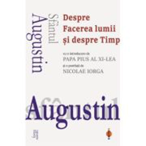 Sfantul Augustin, Despre Facerea lumii si despre Timp (cu o introducere de Papa Pius al XI‑lea si o postfata de Nicolae Iorga) Iata ca, dupa 1500 de ani, Sfantul Augustin (354-430) ne vorbeste in continuare. Surprinzator cat de relevanta este si astazi experienta umana si spirituala a acestui mare ganditor, nascut in zorii crestinismului si care l-a descoperit pe Hristos in launtrul cautarilor sale. Trecand dincolo de cadrul unui sistem filosofic si indreptandu-si curiozitatea catre doua dintre elementele importante ale fiintarii crestine, Facerea si Timpul, Augustin este „intuitiv si poet vizionar“. El scrie parca pentru omul de azi care traieste in aceasta lume pipernicita, indiferenta la orice transcendenta, si totusi pentru omul care are sansa de a-si recapata demnitatea crestina. „In Augustin a trait, nu un pagan, ci un neoplatonician, mai ales un manihean, impotriva caruia s-a luptat cu inversunare, ca sa-l distruga, dar care, necontenit, dupa fiecare lupta, ridica iarasi in adancul sufletului o intrebare: la aceasta nu te-ai gandit?! Si pe atunci intrebarile pe care si le punea sufletul omenesc, intrebarile despre natura asa de misterioasa pentru acea vreme, erau nesfarsit de multe si chinuitoare. Dumnezeu este etern. Dar inainte de crearea lumii ce a fost? Cum a trait Dumnezeu inainte de crearea lumii? Nu erau ceasuri, nu erau zile, nu erau ani! Si el incerca a inlatura toate obiectiile: dar atunci nu erau inca zilele, anii, secolele, lucruri care sunt toate in legatura cu creatiunea; inainte domnea acel infinit divin, in care nu putem veni noi cu impartirile noastre de vreme.“ (Nicolae Iorga) Sfantul Augustin, Despre Facerea lumii si despre Timp