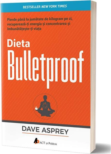 Dieta Bulletproof / The Bulletproof Diet scrisă de Dave Asprey este cartea de care ai nevoie în cazul în care dorința ta nu este numai de a slăbi, ci mai degrabă de a face o schimbare în viața ta, care să se concretizeze într-o formă mai bună, în mai multă energie și mai multă vitalitate. Asta pentru că, spune autorul: „Dieta Bulletproof nu înseamnă doar să pierzi în greutate rapid sau să te simți fantastic, este o hartă pentru a-ți îmbunătăți corpul și mintea din interior spre exterior, eliminând simultan inflamația și vina care apar adesea odată cu stresul ridicat, așteptările ridicate și performanța ridicată”. Conceptul cu care ne familiarizează Dave Asprey este cel de biohacking, pe care autorul îl descrie ca fiind „arta de a folosi tehnologia ca să schimbi mediul atât din interiorul, cât și din exteriorul corpului tău, pentru a prelua controlul și a-l determina să facă ce vrei tu”. Practic, biohacking-ul este foarte asemănător cu ceea ce fac hackerii de calculatoare. Aceștia schițează harta unui sistem computerizat, identifică o slăbiciune pe care o pot exploata și apoi pătrund în sistem, preluând controlul. În același mod, Dave Asprey a început să cerceteze care erau slăbiciunile organismului său și ce îi influența performanța. Pe baza mai multor experimente și cercetări s-a născut Dieta Bulletproof, care l-a ajutat nu doar pe Dave Asprey, dar și pe prietenii și membrii familiei lui să piardă în greutate până la jumătate de kilogram pe zi. Dieta milionarului supraponderal din Silicon Valley Așadar, autorul garantează reușita dietei Bulletproof prin exemplul personal. Asprey a slăbit cu această dietă 45 de kilograme reușind să își schimbe astfel complet viața. În jurul vârstei de 25 de ani Dave Asprey era un antreprenor multimilionar din Silicon Valley. Marea lui problemă erau însă cele 136 de kilograme pe care le cântărea. Starea lui de sănătate era grav afectată de aceste multe kilograme în plus, iar la doar 30 de ani risca în orice clipă să sufere un atac de cord sau un atac cerebral. În condițiile date, o schimbare radicală în viața lui nu era doar necesară, era vitală. Conștientizând acest lucru, a încercat toate tipurile de diete posibile: Zone, Atkins, diete cu puține grăsimi, diete lichide, diete bogate în proteine și chiar și o dietă raw vegană. Kilogramele dispăreau la fiecare dietă, însă se întorceau mereu înapoi. Asta până să experimenteze Dieta Bulletproof… Ce are în plus Dieta Bulletproof față de alte diete? Faptul că ea nu este doar despre kilograme, ea este în aceeași măsură despre concentrare, energie și performanță, pentru că, spune autorul: „dieta ta nu stă doar la baza greutății tale, ci totodată a IQ-ului tău, a nivelului tău de stres, a riscului de îmbolnăvire, a performanței fizice, a îmbătrânirii și chiar a voinței”. Slăbești fără a te simți niciodată flămând Alte titluri pentru DaveAsprey (autor): Bulletproof. Cartea de bucate (2022) , Dieta Bulletproof. Pierde până la jumătate de kilogram pe zi, recuperează-ți energia și concentrarea și îmbunătățește-ți viața (2022) , Supermintea: Planul Bulletproof pentru activarea energiei cerebrale latente, ca să lucrezi mai inteligent și să gândești mai rapid în doar două săptămâni (2022) , Mai inteligent, nu mai greu (2024) ,