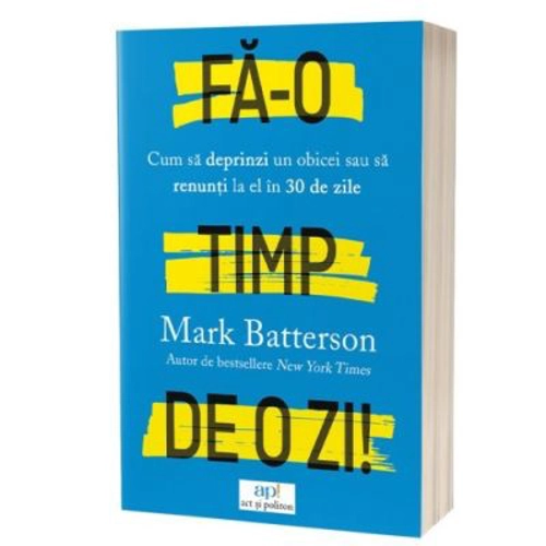 Pe parcursul a 30 de zile, cartea te va ajuta sa iti analizezi obiceiurile. Ea cuprinde zeci de povesti si studii, precum si cele mai bune practici. Arta si stiinta formarii obiceiurilor sunt analizate din mai multe perspective: psihologica, neurologica si teologica, obiectivul fiind sa iti dezvolti la maximum potentialul, deoarece potentialul este darul lui Dumnezeu pentru tine. Ceea ce faci tu reprezinta darul pe care i-l faci lui Dumnezeu, formandu-ti sau renuntand la un obicei care te va ridica sau te va dobori. Fa-o timp de o zi: Cum sa deprinzi un obicei sau sa renunti la el in 30 de zile / Do It for a Day: How to Make or Break Any Habit in 30 Days de Mark Batterson este despre arta si stiinta formarii obiceiurilor din mai multe perspective: psihologica, neurologica si teologica, scopul cartii fiind acela de a te ajuta sa-ti deconstruiesti si sa-ti reconstruiesti obiceiurile zilnice. Dat fiind faptul ca un simplu obicei ne poate ajuta sa ne recapatam forma fizica, sa ne castigam libertatea financiara, sa avem o stare de spirit mai buna sau sa avem un mariaj fericit si sanatos, autorul recurge la tehnici testate, a caror eficienta a fost dovedita in timp, pentru a ne arata cum sa scapam de obiceiurile proaste si cum sa ne formam obiceiuri bune.„Intreaga noastra viata nu este decat o multime de obiceiuri – practice, emotionale si intelectuale – organizate sistematic pentru bunastarea ori tristetea noastra si care ne poarta ireversibil inspre implinirea destinului nostru”, spunea parintele psihologiei americane, William James.