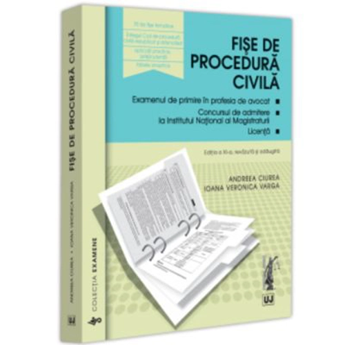 Prezentarea lucrarii. Aflate la a XI-a editie, cele 70 de Fise de procedura civila abordeaza materia dreptului procesual civil intr-o maniera logica si structurata, permitand asimilarea ideilor si inlantuirea coerenta a acestora, intr-un timp optim. Puncte forte. Tabelele sinoptice si comparative, completate la fiecare noua editie a lucrarii, reprezinta o sinteza pedagogica, clara, care faciliteaza intelegerea, fixarea si recapitularea materiei. In plus, sunt incluse aplicatii practice si jurisprudentiale, care vin sa consolideze aspectele teoretice punctate in cadrul fiselor. De asemenea, fiecare editie este completata cu decizii recente, relevante pentru procedura civila, pronuntate de Inalta Curte de Casatie si Justitie (in recursuri in interesul legii si pentru dezlegarea unor chestiuni de drept) ori pronuntate de Curtea Constitutionala. Publicul-tinta. Fisele se adreseaza studentilor si absolventilor facultatilor de drept care vor sa stapaneasca si sa mobilizeze rapid cunostinte fundamentale de procedura civila, in perspectiva examenelor de licenta si de admitere, definitivare sau promovare in profesiile juridice. Despre autoare. Andreea Ciurea – conf. univ. dr. in cadrul Facultatii de Drept a Universitatii „Transilvania” din Brasov; avocat Ioana Veronica Varga – lector univ. dr. in cadrul Universitatii „Babes-Bolyai” din Cluj-Napoca; avocat