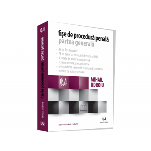 42 de fise tematice 73 de teme de analiza si dezbatere 4 tabele de analiza comparativa scheme teoretice recapitulative jurisprudenta relevanta structurata pe materii modele de acte procesuale Prezentele fise au alcatuit, inca din 2012, singura lucrare care a abordat, intr-o grafica inovatoare si o structura intuitiva, Partea generala a Codului de procedura penala, dorind sa se materializeze intr-un instrument eficient, care sa permita oricarui jurist sa isi fixeze facil o perspectiva logica asupra materiei. PUNCTE FORTE: • explicatii clare, apte sa asigure maxima eficienta in sustinerea oricarui examen de Procedura penala, Partea generala; • analiza tuturor deciziilor pronuntate in recurs in interesul legii (RIL) si a hotararilor prealabile pentru dezlegarea unor chestiuni de drept (HP) date de Inalta Curte de Casatie si Justitie, precum si a solutiilor pronuntate de Curtea Constitutionala pana la finalul lunii aprilie 2018; • solutii jurisprudentiale recente in aplicarea noului Cod de procedura penala; • structuri grafice care urmaresc logica functionala a fiecarei institutii si faciliteaza asimilarea rapida a informatiilor; • TEME DE ANALIZA SI DEZBATERE (TAD). Scopul TAD nu este acela de a obtine un raspuns transant cu privire la o problema de drept, ci de a testa capacitatea cititorului de a diseca si dezbate o situatie factuala sub toate fatetele posibile si de a-si prezenta argumentele intr-o maniera clara si logica. Deopotriva, TAD pot conduce la crearea de noi teme de discutii apte sa releve acuratetea rationamentului cititorului si capacitatea de a efectua distinctii relevante in materia dreptului procesual penal; • suplimentarea numarului de fise; • denumiri marginale care preceda fiecare solutie jurisprudentiala, asemanatoare standardelor codurilor adnotate; • TABELE DE ANALIZA COMPARATIVA (TAC). Scopul TAC este acela de a contribui la sedimentarea cunostintelor prin observarea diferentelor dintre institutiile comparate. ACQUIS-ul lucrarii: • elaborarea acesteia de catre un teoretician si practician cu experienta, capabil sa ofere o viziune armonizata asupra materiei penale si procesual penale; • prezentarea materiei intr-o maniera clara si structurata, apta sa asigure fixarea rapida a cunostintelor necesare pentru promovarea examenelor de admitere in profesie; • organizarea continutului in parti teoretice, care ofera informatii teoretice tehnice si precise, si parti practice, care cuprind solutiile relevante pronuntate de instantele judecatoresti in materie. Toate acestea se constituie in atuuri ce recomanda lucrarea de fata ca pe cel mai util si facil instrument pentru cei care vor sa recapituleze rapid materia pentru examenele consacrate din domeniu, dar si pentru cei care vor sa dobandeasca in cel mai scurt timp cunostintele teoretice si practice esentiale cu privire la partea generala a dreptului procesual penal. Lucrarea se adreseaza, in egala masura, oricarui jurist: • student, masterand, doctorand; • candidat la examenele de admitere, definitivare sau promovare in profesiile juridice; • practician la inceput de cariera sau cu experienta.