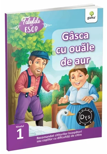 Cine aleargă după doi iepuri nu prinde niciunul! Află ce se întâmplă când doi soți descoperă că gâsca lor face ouă de aur. La sfârșitul cărții găsești exerciții de rezolvat după lectură, precum și un mic dicționar. Fabulele scrise de Esop (620-564 î.Hr.) reprezintă o colecție de povești cu un fir narativ simplu, din care se desprinde cu ușurință o morală, ceea ce le face foarte potrivite ca prime lecturi ale cititorilor începători. Datorită fontului special Dyslexie, sunt recomandate și copiilor mai mari care citesc cu dificultate.
