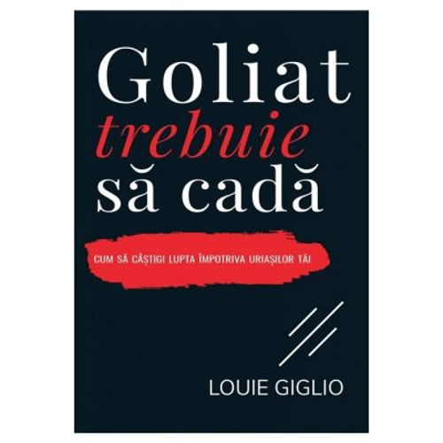 Daca uriasii nostri cad, lucrul acesta I se datoreaza lui Isus. El este ucigasul de uriasi. Eroul acestei istorisiri (al istorisirii noastre) nu este un tanar baiat cu prastie, ci un Salvator imbracat in trup de om care a murit pentru a pune capat oricarui lucru care a incercat sa ne rapeasca viata. Frica Respingerea Dependenta Mania Comoditatea ... trebuie sa cada Te-ai simtit vreodata asa cum s-a simtit regele Saul in fata lui Goliat? Exista in viata ta un urias care te ameninta... un adversar sau o fortareata care iti reduce capacitatea de a trai o viata implinita si libera? Incremenit sub constrangerea respingerii, a fricii, a maniei, a comoditatii sau a dependentei, s-ar putea sa pierzi din vedere promisiunea pe care ti-a facut-o Dumnezeu: Poti sa traiesti o viata de victorie! Nu te multumi cu mai putin. Acesta este motivul pentru care Dumnezeu l-a redus la tacere pe uriasul tau o data pentru totdeauna. In cartea Goliat trebuie sa cada, Louie Giglio prezinta un aspect nou al relatarii clasice despre David si Goliat. Secretul unei vieti traite in libertate fata de uriasii nostri nu depinde de o mai mare maiestrie in manuirea prastiei, ci de atintirea privirilor noastre asupra singurului Biruitor al uriasilor, Isus. Pune-ti nadejdea in El si vei vedea caderea lui Goliat. Louie Giglio este pastorul bisericii Passion City, autorul mai multor bestselleruri si vorbitor de succes in cadrul conferintelor pentru tineri. Este fondator al miscarii Passion, al carei scop este sa investeasca in generatia actuala de tineri pentru a-L cunoaste pe Isus. Louie si sotia lui, Shelley, locuiesc in Atlanta, Georgia. Cuprins Multumiri Uvertura: Uriasul tau se prabuseste 1. Mai mare decat uriasul tau 2. Mort, dar inca mortal 3. Frica trebuie sa cada 4. Respingerea trebuie sa cada 5. Comoditatea trebuie sa cada Interludiu: Uriasul tau este mort 6. Mania trebuie sa cada 7. Dependenta trebuie sa cada 8. O masa intinsa in prezenta dusmanilor 9. Combustibil pentru lupta
