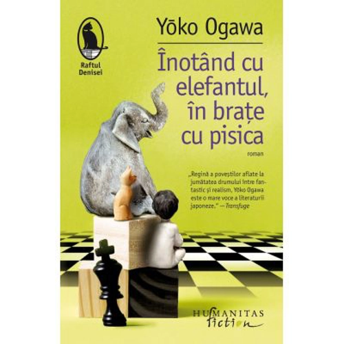 Traducere si note de Raluca Nicolae Un baietel care se naste cu buzele lipite, un elefant condamnat sa traiasca pe terasa unui centru comercial, o fetita disparuta in spatiul dintre doua cladiri, un sofer de autobuz maestru in arta patiseriei si a sahului si o misterioasa papusa-automat fac din Inotand cu elefantul, in brate cu pisica un roman al instantaneelor pline de lirism, stranietate si miracol. Yōko Ogawa continua explorarea relatiei dintre maestru si discipolul-copil din Profesorul si menajera intr-o simfonie a pasiunii impartasite, dar si a sensibilitatii devoratoare. Singuratic si rezervat, un pusti de sapte ani intalneste din intamplare un fost sofer obez, locatar al unui autobuz uimitor. Pasionat de sah, dupa ale carui reguli se ghideaza ca si cum ar fi o religie, acesta ii va descoperi talentul neobisnuit, transformandu-l in urmasul sau spiritual. Baiatul este deopotriva fascinat de un elefant dus candva pe acoperisul unui mare magazin si de o fetita prizoniera in firida intunecoasa dintre doua case din cartierul sau. Cand Maestrul moare si trupul lui ramane captiv in autobuz, micul sahist are convingerea ca a descoperit sentinta fatidica a oricarei existente: „Sa cresti e o drama“.