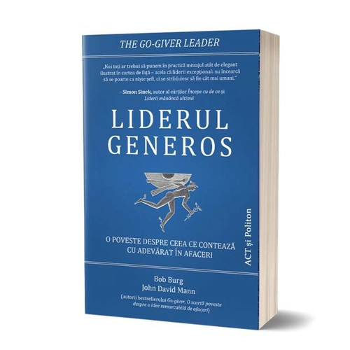 Liderul generos: O poveste despre ceea ce conteaza cu adevarat in afaceri / The Go-Giver Leader: A Little Story About What Matters Most in Business de Bob Burg si John David Mann este o poveste despre leadershipul extraordinar. Eroul cartii, Ben are dificila misiune de a convinge o companie care se confrunta cu dificultati financiare sa fuzioneze cu compania pe care o reprezinta pentru a iesi din impas. O misiune dificila, dar nu imposibila, pentru indeplinirea careia Ben trebuie sa dea dovada de mult tact si sa ajunga sa inteleaga in ce consta de fapt secretul unui leadership extraordinar. O lectura pe care liderii o vor iubi, dar nu numai ei, pentru ca, spun cei doi autori ai cartii: "Poate ca nu esti CEO, prim-ministru sau presedinte. Poate ca nu te afli la carma organizatiei in care lucrezi si nici nu ti-ai infiintat propria companie. Insa, chiar daca nu te afli intr-o "pozitie de leadership" traditionala, asta nu inseamna ca nu te afli intr-o pozitie din care sa-i poti influenta pe altii. Ii poti inspira si sustine pe cei din jurul tau. Poti fi un catalizator pentru excelenta de care sunt capabili ceilalti. Lupta pentru succesul lor. Sprijina-i din toata inima." Ceea ce ofera in plus aceasta carte fata de cartile obisnuite de leadership este povestea... O poveste in care cei doi autori au inclus treptat caracteristicile pe care ei le considera cele mai importante pentru un lider extraordinar. Alte titluri pentru John DavidMann (autor): Instruiţi să ucidă. Cea mai dură şcoală de lunetişti din lume (2018) , Go-giver. O scurtă poveste despre o idee remarcabilă de afaceri (2019) , Liderul generos (Audiobook) (2022) , Alte titluri pentru BobBurg (autor): Transformă-ți adversarii în aliați (2022) , Go-giver. O scurtă poveste despre o idee remarcabilă de afaceri (2019) , Ghid complet de prospectare eficientă a pieței (2021) , Liderul generos (Audiobook) (2022) ,