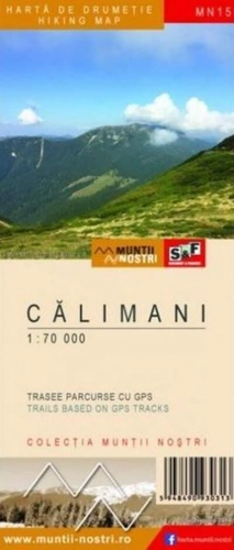 Munții Călimani aparțin lanțului vulcanic ce căptușește latura internă a Carpaților Orientali, situat în zona de contact a munților de încrețire cu marile depresiuni de prăbușire ale Transilvaniei, reprezentând cel mai extins masiv vulcanic din România iar cel mai înalt vârf al lor fiind, cu 2100 m, Vârful Pietrosul Călimanilor. Munții Călimani include cel mai mare crater vulcanic (calderă, stins în prezent) din România cu un diametru de circa 10 km. Pe aria muntelui este Parcul Naţional Călimani cu o suprafață totală de 24.041 ha, are în componență rezervațiile naturale: Rezervaţia geologică Doisprezece Apostoli (cu poteca tematică 12 Apostoli), Rezervaţia ştiinţifică Jnepenişul cu Pinus cembra - Călimani și Rezervaţia naturală Lacul Iezer. Harta Munţilor Călimani poartă indicativul MN15, ceea ce-nseamnă că este al cincisprezecelea număr din colecţia „Munţii Noştri”. Harta s-a editat folosind cele mai actuale tehnici de cartografiere şi s-a tiparit pe hârtie rezistentă la umiditate. Este uşor de citit şi simplu de utilizat datorită stilurilor de reprezentare cartografice, specifice firmei Schubert & Franzke şi datorită structurării practice ale informaţiilor. Totul este la îndemână, exact acolo unde este necesar, fiind utilă atât pasionaţilor de drumeţii cât şi profesioniştilor. Toate traseele au fost parcurse pe teren cu GPS-ul. Acestea sunt descrise în detaliu în limbile română şi engleză, unele trasee având ataşate imagini reprezentative. Fiecare traseu are o casetă tehnică conţinând: marcajul turistic verificat pe teren, ruta traseului, profilul cu punctele de reper mai importante, date referitoare la dificultate, lungime, urcuş total, coborâre totală, timp de parcurgere dus-întors, practicabilitate în funcţie de anotimp etc. Harta conţine şi un caroiaj UTM, un sistem de coordonate metric, fiind util în măsurarea rapidă a distanţelor pe hartă. Umbrirea şi curbele de nivel scot în evidenţă relieful, uşurând orientarea. Toate traseele (track-urile) şi unele puncte de interes (waypoint-uri) vor fi descărcabile de pe website-ul nostru, iar aplicaţiile iPhone şi Android vor risipi aura nostalgică a hărţii, conferind produsului complexitatea tehnică obligatorie secolului în care trăim. Să vă bucuraţi de această hartă, sus pe culmile însorite ale Munţilor Călimani, scrutând în zare culmile vecine, cele care vor da în curand numele următoarelor hărţi din colecţia „Munţii Noştri”.