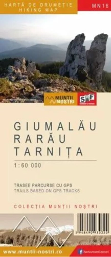 Munţii Giumalău-Rarău-Tarniţa constituie o zonă turistică de mare importanță în cadrul Carpaților Orientali fiind formată din trei masive strâns legate a căror importanță pentru turism derivă din următoarele aspecte: varietatea peisajelor naturale impuse de relief și vegetație; accesibilitatea determinată de prezența culoarelor de vale ce încadrează cele două masive montane. Aici se găsesc două centre turistice de mare însemnătate ce se află la periferie (Câmpulung Moldovenesc și Vatra Dornei), ce constituie puncte de plecare pentru principalele fluxuri de turiști. Masivul Giumalău, care este partea vestică a unităţii, are următoarele limite: la nord Valea Moldovei, la est văile opuse Giumalău şi Colbu, la sud Valea Bistriţei şi Depresiunea Dorna, la vest Valea Bistriţei şi Pasul Mestecăniş. Are altitudinea maximă în Vârful Giumalău (1857 m) şi este format din şisturi cristaline. Masivul Rarău, care este partea centrală a unităţii, are următoarele limite: la nord Valea Moldovei, la sud-est văile opuse Chiril şi Gemenea - văi care izvorăsc de sub Curmătura Prislop, la sud Valea Bistriţei, la vest văile opuse Giumalău şi Colbu. Cel mai înalt punct din acest masiv este Vârful Rarău (1651 m). Fiind formate din klippe calcaroase, aici s-au format renumitele Pietrele Doamnei. Masivul Tarniţa, care este partea estică/sud-estică a unităţii, mai puţin cunoscut turistic, are următoarele limite: la nord-vest văile opuse Chiril şi Gemenea, la est văile opuse Suha şi Cotârgaşi (linie unde se întâlneşte cu Munţii Stânişoarei), la sud şi la vest Valea Bistriţei. În Vârful Bâtca Oblâncului are punctul maxim, la altitudinea de 1474 m. Format tot din klippe calcaroase, dar cu apariţii de mineralizări. Harta Munţilor Giumalău-Rarău-Tarniţa poartă indicativul MN16, ceea ce-nseamnă că este al şaisprezecelea număr din colecţia „Munţii Noştri”. Harta s-a editat folosind cele mai actuale tehnici de cartografiere şi s-a tiparit pe hârtie rezistentă la umiditate. Este uşor de citit şi simplu de utilizat datorită stilurilor de reprezentare cartografice, specifice firmei Schubert & Franzke şi datorită structurării practice ale informaţiilor. Totul este la îndemână, exact acolo unde este necesar, fiind utilă atât pasionaţilor de drumeţii cât şi profesioniştilor. Zona Rarău apare la o scară mai detaliată: 1 : 20 000. Toate traseele au fost parcurse pe teren cu GPS-ul. Acestea sunt descrise în detaliu în limbile română şi engleză, unele trasee având ataşate imagini reprezentative. Fiecare traseu are o casetă tehnică conţinând: marcajul turistic verificat pe teren, ruta traseului, profilul cu punctele de reper mai importante, date referitoare la dificultate, lungime, urcuş total, coborâre totală, timp de parcurgere dus-întors, practicabilitate în funcţie de anotimp etc. Harta conţine şi un caroiaj UTM, un sistem de coordonate metric, fiind util în măsurarea rapidă a distanţelor pe hartă. Umbrirea şi curbele de nivel scot în evidenţă relieful, uşurând orientarea. Aplicaţiile disponibile pe platformele iOS şi Android vor risipi aura nostalgică a hărţii, conferind produsului complexitatea tehnică obligatorie secolului în care trăim. Să vă bucuraţi de această hartă, sus pe culmile însorite ale Munţilor Giumalău-Rarău-Tarniţa, scrutând în zare culmile vecine, cele care vor da în curând numele următoarelor hărţi din colecţia „Munţii Noştri”.