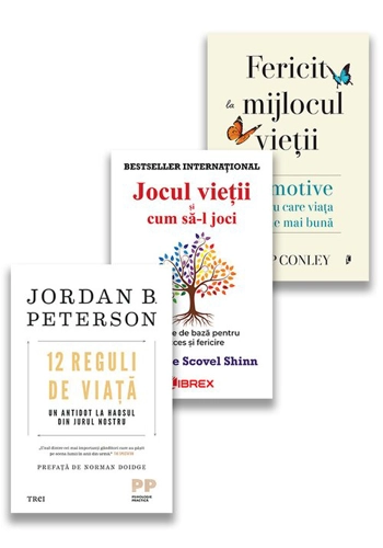Pachetul contine urmatoarele carti: 12 Reguli de viata. Un antidot la haosul din jurul nostru Jordan B. Peterson este unul dintre cei mai sclipitori ganditori ai momentului. Psihologul canadian a devenit in ultimii ani un veritabil fenomen mediatic: pe YouTube poate fi vazut in peste 200 de prelegeri si interviuri, care aduna mai bine de 30 de milioane de vizualizari; iar pe Twitter si Facebook este urmarit de 300 000 de oameni. Plin de umor si asociind in mod surprinzator adevaruri ale traditiei occidentale cu ultimele descoperiri din neurostiinte, Peterson ne povesteste despre homari si asertivitate, despre skateboarding si adevaratii barbati, despre Iadul ranchiunii si arogantei, dar si despre lumina pe care o poate aduce in viata noastra mangaierea unei pisici sau un moment de sinceritate fata de sine - dar si fata de apropiatii nostri. Plecand de la revelatiile marilor religii ale lumii, dar si de la capodoperele literare si filosofice (ale unor Goethe, Nietzsche sau Dostoievski), autorul ne indeamna sa revenim la clasicele virtuti (disciplina, curaj, onestitate, prietenie etc.) si sa ne asumam raspunderea pentru existenta noastra tragica, in care exista totusi un sens ce astepta sa fie cautat. Intr-o lume in care structura familiei este in colaps, educatia este adesea impregnata de ideologie, iar societatea politica a ajuns sa fie periculos de polarizata, cele 12 Reguli de viata ofera un antidot: redescoperirea vechilor adevaruri si valori, care ne pot ajuta, in plina epoca relativista, sa ducem o viata mai buna, mai luminoasa, mai chibzuita. JORDAN B. PETERSON, profesor canadian de psihologie, preda la Universitatea din Toronto, sustinand totodata conferinte publice cu o audienta remarcabila. Este apreciat nu doar pentru criticile sale cultural-politice - cum ar fi obiectiile la adresa "corectitudinii politice" -, dar si pentru deschiderea sa catre religie, filosofie, literatura si studii politice. In calitate de psiholog clinician, Peterson lucreaza cu clienti afectati de depresie, anxietate sau schizofrenie, fiind si consilier al unor manageri de top din firme din domeniul juridic. A fost consultant la Secretariatul General al ONU si a mai predat la Harvard. A scris mai bine de o suta de articole stiintifice pe teme diverse (de la terapia dependentelor la psihologia personalitatii) si este autorul unui revolutionar tom dedicat psihologiei religiei, Maps of Meaning: The Architecture of Belief (1999), in curs de traducere la Editura Trei. Mai multe detalii, pot fi gasite pe conturile autorului de pe Facebook si YouTube, dar si pe site-ul sau personal, www.jordanbpeterson.com. "A durat mult pana am gasit titlul: 12 Reguli de viata: un antidot la haosul din jurul nostru. Acesta sugereaza clar faptul ca oamenii au nevoie de principii ordonatoare, pentru a evita instaurarea haosului. Avem nevoie de reguli, standarde, valori - si luati singuri, dar si luati impreuna. Suntem niste animale de povara, obisnuite sa traga la jug. Avem nevoie de o incarcatura care sa ne justifice existenta mizerabila. Avem nevoie de rutina si de traditie. Aceasta inseamna ordine. Daca am trai cum se cuvine, am fi capabili sa toleram povara constiintei de sine. Daca am trai cum se cuvine, am reusi sa ne asumam propria fragilitate si mortalitate, fara sa ne simtim ca niste victime nevinovate, fara sa cadem in starea de invidie sau sa ajungem, mai apoi, la dorinta de razbunare si distrugere. Daca am trai cum se cuvine, nu ar mai fi nevoie sa apelam la securitatea oferita de totalitarisme, pentru a ne proteja de recunoasterea propriei finitudini si ignorante. Poate ca am reusi sa evitam cararile ce duc spre Iad - iar secolul XX ne-a aratat cam cat de real poate fi Iadul" - Jordan B. Peterson Jocul vieții și cum să-l joci - cea mai cunoscuta carte despre succes din lume! Majoritatea oamenilor consideră viața o luptă, dar nu este o luptă, ci un joc. Este un joc ce însă nu poate fi jucat fără cunoașterea legilor spirituale. Florence Scovel Shinn este unul dintre cei mai populari profesori de predare a modalităților de succes. Cărțile ei, populare în toată lumea, au schimbat viețile a milioane de oameni. Jocul vieții și cum să-l joci ne arată că ne putem bucura de lungi perioade de sănătate, prosperitate și fericire. Autoarea ne împărtășește povești adevărate din viața reală pentru a ilustra modul în care atitudinea și afirmațiile pozitive reușesc invariabil să transforme orice persoană într-un învingător, capabil să controleze circumstanțele și să elibereze abundența prin cunoașterea legilor spirituale. „Ca să jucăm cu succes jocul vieții trebuie să ne antrenăm imaginația. O persoană cu o imaginație antrenată pentru a vizualiza numai lucruri bune aduce în viața ei «orice dorință dreaptă a inimii sale», sănătate, bogăție, iubire, prieteni, perfecta exprimare a sinelui, cele mai nobile idealuri.“ Fericit la mijlocul vietii. 12 motive pentru care viata devine mai buna Autorul de bestsellere New York Times si co-fondatorul/CEO al Academiei Moderne pentru Varstnici „ne reaminteste tuturor sa savuram intelepciunea, autocunoasterea si bucuria care insotesc [deceniile de mijloc] ale vietii noastre” (Parintele Richard Rohr) si „ofera un plan clar pentru a ne crea viata pe care ne-o dorim” (Gretchen Rubin) Criza varstei de mijloc este tinta atator glume, insa aceasta etapa a vietii indelung uitata are o parte buna. Ce-ar fi daca am putea sa regandim tranzitia naturala a varstei de mijloc nu ca o criza, ci ca o crisalida - un moment in care ceva profund se trezeste in noi, pe masura ce ne schimbam pielea, ne deschidem aripile si polenizam lumea cu intelepciune? In Fericit la mijlocul vietii. 12 motive pentru care viata devine mai buna, Chip Conley ofera o abordare alternativa de a privi varstele 40, 50 si 60. Bazandu-se pe cele mai recente cercetari in domeniul stiintelor sociale, povesti inspiratoare si intelepciune atemporala, el dezvaluie 12