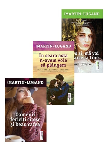 Pachetul Agnes Martin-Lugand contine urmatoarele carti: 1. Oamenii fericiti citesc si beau cafea A plecat din Paris sa se uite pe sine. Dragostea pe care o va intalni va schimba totul. Povestea lui Diane incepe in mod brutal cu moartea sotului si a fetitei sale, eveniment care o arunca in cea mai cumplita depresie. Totul se opreste in loc, in afara de inima ei, care continua sa bata. Cu incapatanare. Dureros. Zadarnic. Cand cel mai bun prieten si asociat in mica afacere cu o cafenea literara la Paris, Felix, ii propune o calatorie ca inceput pentru o noua viata, Diane alege sa indeplineasca o mai veche dorinta a fostului ei sot si se refugiaza departe de lume, intr-o mica asezare din Irlanda. O intalnire neasteptata cu un barbat taciturn o face pe Diane sa vada din nou lumea cu incredere si cu forta regasita. Aceasta poveste despre impacarea cu sine contine dialoguri convingatoare si e spusa intr-un stil simplu, nepretentios, avand chiar si accente de umor. 2. In seara asta n-avem voie sa plangem O femeie in pragul mortii. Un barbat incapabil sa-si puna capat vietii. Vocile celor doi se ridica pe rand pentru a ne impartasi povestea lor, suferintele, demonii lor si, mai mult decat orice, o dragoste nebuna. O dragoste nebuna, care inspira, reuneste si salveaza in aceeasi masura in care poate sa distruga si sa dezbine. „Pentru mine, In seara asta n-avem voie sa plangem e un roman foarte special. Nu doar pentru ca e al zecelea. Ci si pentru ca romanul insusi pare ca mi-ar fi dictat scrierea lui. A fost tulburator sa descriu chinul lui Joshua, pe cand Madeleine a fost mai discreta, m-a lasat sa ma apropii de ea treptat si cu blandete.“ – Agnès Martin – Lugand „Un roman fascinant.“ – Nathalie Iris, presedinta Prix des Libraires „Agnès Martin-Lugand s-a impus pe piata literara franceza prin scriitura ei delicata si subtilitatea psihologica, dovedite prin felul in care isi construieste personajele.“ – Actuallité Dupa ce a profesat ca psiholog timp de sase ani, Agnès Martin-Lugand s-a dedicat scrisului, publicandu-si primul roman, Oamenii fericiti citesc si beau cafea, in regim propriu, pe platforma Kindle Amazon, in decembrie 2012. Remarcata rapid de bloggerii atenti la mediul literar virtual, a trezit interesul Editurii Michel Lafon, care i-a propus debutul in lumea editoriala traditionala. Astfel, romanul sau a cunoscut un succes urias nu doar in Franta, ci in intreaga lume, drepturile de ecranizare fiind achizitionate de o casa de productie de la Hollywood. Agnès Martin-Lugand se numara printre primii zece cei mai de succes autori francezi: cartile ei s-au vandut in peste 3 milioane de exemplare in intreaga lume si au fost traduse in 35de limbi. 3. Intr-o zi ma voi intoarce la tine Roman recompensat cu Premiul „Les Petits Mots des Libraires“ 2021 In timpul peregrinarilor ei prin Franta, Hermine, o tanara dezorientata, obosita de viata, ajunge intamplator in insoritul Provence, unde i se propune sa lucreze la un hotel. Fata accepta fara prea mare tragere de inima si descopera ca hotelul cu pricina este de fapt o proprietate impozanta, plina de viata, ce poarta un nume rusesc: Dacea. Jo si Masa, stapanii acestui loc magic, devin in scurt timp familia pe care Hermine n-a avut-o niciodata, oferindu-i dragostea si sprijinul dupa care a tanjit mereu. Douazeci de ani mai tarziu, Hermine este o femeie implinita, cu doi copii minunati si care s-a dedicat trup si suflet administrarii acestei proprietati de vis. Insa moartea fulgeratoare a lui Jo, devenit o legenda a locului, va zgudui din temelii tot ceea ce Hermine si familia sa adoptiva au construit impreuna. Secrete dureroase ies la iveala si Hermine va fi pusa in fata celei mai dificile alegeri din viata ei… „O poveste induiosatoare despre ranile copilariei, despre doliu si renastere.” – Le Parisien „Agnès-Martin Lugand scrie cu nespusa intelegere atat despre reusitele, cat si despre esecurile noastre.” – Le Parisien Week-End „Citind romanele celebrei autoare franceze, patrunzi intr-o lume aparte, calatoresti in tinuturi indepartate si te indragostesti de personajele pe care le creeaza. Toate cartile ei au o putere hipnotica, iar Intr-o zi, ma voi intoarce la tine cu atat mai mult.” – Pretty Little Books
