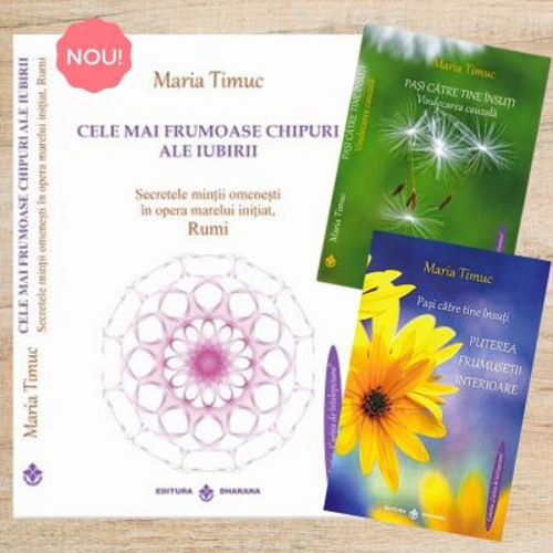 Pachet Despre frumusetea si iubirea interioara, autor Maria Timuc Cele mai frumoase chipuri ale iubirii, autor Maria Timuc - Traducere texte Rumi: Marius Ghidel Cele mai frumoase chipuri ale iubirii. Secretele mintii omenesti in opera marelui initiat, Rumi - Maria Timuc ... Golgota iubirii este un munte launtric, pe noi insine trebuie sa ne readucem in contact cu Sinele, cu iubirea din noi. Inlauntru pierdem puterea noastra de a iubi si tot aici trebuie sa cautam calea catre redobandirea propriei puteri, catre regasirea Sinelui si a iubirii sale. Mai presus de a fi iubiti de altii este... sa traim inlauntrul nostru starea de a iubi, caci atunci Domnul ni se arata noua sub forma trairii numita iubire. Chipul Domnului „ca iubire” e-n aceasta soapta, pe care o pot auzi toate fiintele vii. Iubirea infloreste trandafirul si te infloreste pe tine. Cand tu iubesti, lumea intreaga straluceste, devin frumoase chiar si lucrurile pe care le credeai urate. Cand privesti cu ochii iubirii, cand percepi cu ochii ei, percepi constient, devii constient de frumusetea, de gratia si de binecuvantarea existentei. Iubirea poate vedea ca nu exista nimic urat, nimic rau, nimic negativ, ca toate cele nascute din iubire au atributul fundamental al luminii si al frumusetii... Iubirea este „CONSTIENTA”, ea nu poate vedea nimic urat, caci uratul, raul, negativul sunt facute de mintea noastra, nu de Domnul. Ele sunt facute prin eroare de perceptie. Raul este un contrast care ne dezvaluie unde gresim si cand gresim, unde si cand ne-am pierdut puterea de a iubi. De aceea, frica de rau este, de fapt, frica noastra de a constientiza ca ne-am pierdut iubirea. Frica de rau este frica de a intelege ca am gresit, indepartandu-ne de Sine, de Dumnezeu, de iubirea care ne infloreste dinlauntru, cum infloreste si trandafirul. ... Oamenii nu devin constienti cand sunt criticati aspru din afara, ei sunt precum copiii. Cand ii criticam sau le spunem ca-i absurd ce fac, se simt atacati, iar starea de victima in care ei se scufunda ii face si mai inconstienti de adevar, trezindu-le agresivitatea. Prin atac nu vom aduce niciodata pe cineva la constienta. Atacandu-ne unii pe altii, nu facem altceva decat sa hranim gandurile irationale si emotiile negative, iar acestea se vor rasfrange asupra comportamentului nostru. Inconstienta ne face imuni la iubire, incapabili sa iubim, incapabili sa rationam, sa gandim corect si sa actionam corect. Cearta incepe din pricina Egoului, care simte dorinta imperioasa de a-l strivi pe celalalt, de a-i spune ce-i bine si ce nu-i bine sa spuna, nu doar sa faca. Cearta e un semn al irationalitatii, un semn al razboiului, al conflictului, al separarii. ... Reactia ta negativa ia jumatate din sacul de pietre si ti-o pune pe umeri; tocmai de aceea devii vinovat in ochii celuilalt, ii iei greutatea, intri in suferinta lui, in inconstienta lui, devii la fel de absurd ca el, devii el. Puterea adevarata nu este in riposta, in afirmarea fortata a inteligentei, in insistenta, in contradictie, in respingere, in lupta sau in duelul verbal in care ti se da dreptate. Puterea e-n acceptare. Absurdul pe care-l vezi uimitor se va intelege pe sine ca absurd doar prin acceptare, asta-i cheia vietii constiente. ... Daca copilul tau vrea prajituri, vrea prajituri. S-ar putea sa-l convingi cu forta sa renunte, dar aceasta nu este putere. Forta ta nu este putere. Este un fel in care tu devii lumea care-ti pune copilul in genunchi. ... Numai Domnul ar putea trimite dragostea in sufletul celui pe care-l vrei indragostit de tine, asa ca roaga-te Domnului pentru ceea ce tu nu poti face. ... A ne cunoaste pe noi inseamna a renunta la definitiile mintii despre noi insine si a trai, pur si simplu, dincolo de iluziile mintii, dincolo de concepte, de etichetari si de perceptii, iubirea care suntem. ... Nu te-ai nascut pentru nefericire, doar ai fost invatat ca nefericirea exista. N-o mai afirma, indoieste-te de ea. ... Descopera Cerul din tine si pluteste cu indrazneala in adancul frumusetii sale, caci aceasta este destinatia sufletului tau si capatul infinitului pe care-l cauti. ... In interiorul tau este cauza tuturor suferintelor, este cauza tuturor fericirilor. Daca vrei sa porti in tine iubirea atat de ravnita de oameni, trebuie sa fii constient ca in tine este cauza suferintei si ca numai tu ai puterea de a o schimba. Decizia ta fundamentala ar trebui sa fie aceea de a iubi tu in fiecare detaliu, in fiecare clipa, in fiecare zi. ... Sfintii inchisorilor au dovedit ca inchisoarea, chinurile, foamea, frigul si presiunile psihologice la care au fost supusi nu le-au luat iubirea si lumina launtrica, dimpotriva. Lumina lor s-a inaltat ca o torta spirituala, puternica, ajutandu-i sa invinga vicisitudinile vietii si daruindu-le oportunitatea de a-si consolida credinta in Dumnezeu, in Hristos, in puterea iubirii divine. In consecinta, iubirea si credinta i-a hranit si i-a salvat, iar rautatea altora si opresiunea venita din lume i-a ridicat si le-a aratat drumul catre iubire. ... Cum spunea Lao Tzu: „Inainte de iluminare – tai lemne, car apa: Dupa iluminare – tai lemne, car apa”. Adica, devii intelept cand intelegi ca suferinta vietii tale a fost cauzata de tendinta mintii tale de a complica lucrurile. Intelepciunea te intoarce la simplitate. Nu esti in aceasta lume pentru a suferi, ci pentru a te bucura de existenta ta, orice ai face. Esti aici sa descoperi ca simplitatea este esenta ta. ... Daca te-ai indepartat de partenerul tau de viata, nu te mai intelegi cu el si-ti pare ca el te frustreaza, ca nu-ti daruieste, atunci trebuie sa stii ca este posibil ca tu sa faci lucrurile pentru care il acuzi pe el. Tu nu mai daruiesti, ci astepti sa primesti. Tu nu mai ai iubire pentru el. Inverseaza lucrurile indata. Da-i ceea ce iti lipseste. Daca vrei atentie, da-i atentie. Daca vrei sa fie calm si cald, fii tu calm(a) si cald(a). Daca vrei bucurie, fa lucruri care il bucura pe celalalt. ... Suferintele pe care le-au trait oamen