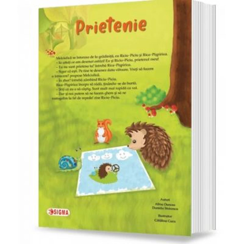 Cartea uriasa „Prietenie” se adreseaza elevilor de la clasa pregatitoare, dar si celor de la gradinita. In acest volum, Alina Oancea si Daniela Stoicescu, autoarele cartilor uriase din seria „Melciulica”, va invita sa cititi o savuroasa poveste despre prietenie. ”Prietenul la nevoie se cunoaste” este o zicala care se desprinde din povestea in care doi dintre prietenii simpaticului melc sar in ajutorul acestuia. Pornind de la imaginile si textele prezente in carte se pot organiza numeroase activitati cu copiii, la clasa sau de catre parinti, acasa.