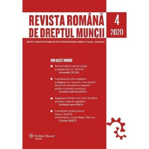 REVISTA ROMANA DE DREPTUL MUNCII Este singura revista de pe piata romaneasca a publicatillor de drept dedicata dreptului muncii - informatie actuala, completa, care se adreseaza profesionistitor. Rubrici concepute special pentru: contractut individual de munca; salarizare; sanatatea si securitatea in munca; piata muncii si potitici sociate protectie sociala; profesii conflicte de munca dreptut cotectiv at muncii; drept international al muncii Dosar - o problema importanta de dreptut muncii este dezbatuta si clarificata de profesionisti! Informatiite oferite de Revista Romana de Dreptut Muncii sunt utite oricarui angajator, dar mai ates cetor specializati in domeniut relatiitorde munca: Avocat; Jurist al unei companii sau al unei institutii publice; Director Generat al unui IMM; Inspector de resurse umane; Specialist in protectia muncii; Magistrat interesat de evolutia doctrinei si jurisprudentei