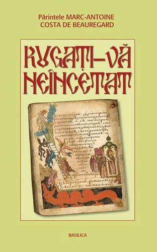 „Republicarea cărții Rugați-vă neîncetat a Părintelui Marc-Antoine Costa de Beauregard, unul dintre cei mai rafinați cunoscători și autentici trăitori ai Ortodoxiei în Occident, constituie pentru editura Basilica un îmbucurător eveniment editorial. Scopul acestei valoroase cărți de spiritualitate ortodoxă este, după însuși cuvântul autorului, reamintirea „învățăturii veșnice și nestricate a căilor de dobândire a Împărăției Cerurilor […] într-o formă nouă, aproape de inima și sufletul fraților noștri trăitori în vremurile noastre”. Întemeiat pe Sfintele Evanghelii și pe Sfânta Tradiție, dar și pe o bogată experiență duhovnicească personală, Părintele Marc-Antoine Costa de Beauregard ne reamintește în paginile acestei cărți consacrate marii teme a rugăciunii câteva mari adevăruri ale spiritualității creștin-ortodoxe: existența a două împărății, cea a lumii căzute din punct de vedere spiritual și aceea a lumii cerești, Împărăția Cerurilor, care se cucerește cu multă silință, prin curățirea progresivă a sufletului, singura cale de a ne face părtași la slava Celui care ne-a creat; existența și importanța omului lăuntric; Hristos – Adevărul care eliberează; necesitatea duhovnicească a rugăciunii neîncetate și a curățirii inimii; „asemănarea” cu Dumnezeu – calea mântuirii omului.” Editura Basilica Alte titluri pentru Marc-AntoineCosta de Beauregard (autor): Mică dogmatică vorbită (2022) ,
