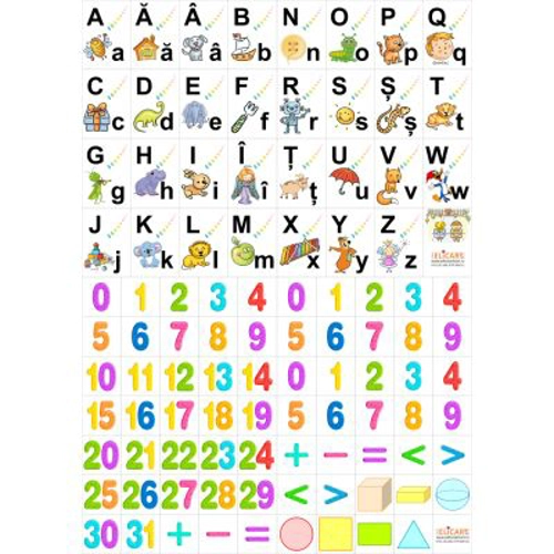 A4 Setul contine: • 2 planse cu literele alfabetului • 2 planse cu cifre, numere, figuri si corpuri geometrice