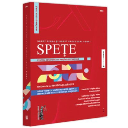 Proba scrisa de verificare a cunostintelor juridice face parte din prima etapa a concursului de admitere la INM/in magistratura, urmarind sa puna in evidenta capacitatea de analiza critica si sinteza, coerenta in abordare si exprimare, intelegerea institutiilor de drept penal si procesual penal, fiind conceputa in ansamblul concursului si perceputa de catre candidati ca fiind cea mai dificila dintre probe. De aceea, pregatirea temeinica si, in acelasi timp, aplicata este esentiala pentru reusita. Prezenta lucrare urmareste, cu precadere, verificarea modalitatii de aplicare a cunostintelor juridice in materia dreptului penal si a procedurii penale, fiind realizata de un colectiv de judecatori, practicieni cu experienta in materia penala si procesual penala, precum si cu experienta didactica. Aflata la a patra editie, imbogatita cu un numar de 10 spete fata de editia anterioara, lucrarea insumeaza 60 de teste, reprezentand 120 de spete de drept penal si drept procesual penal, insotite de baremele de rezolvare, cu largi explicatii si trimiteri la textele de lege, la doctrina si jurisprudenta. Fiecare test contine cate 2 spete (de drept penal si drept procesual penal), concepute astfel incat sa acopere in intregime tematica de concurs, sa raspunda nevoilor de aprofundare a institutiilor dreptului ce fac obiectul concursului si, in acelasi timp, sa faciliteze deprinderea modalitatii adecvate de abordare a acestui tip de proba. Editiile anterioare au fost apreciate de catre candidati ca fiind un suport incontestabil pentru pregatirea cu succes a acestei probe; de aceea, autorii au pastrat si in editia de fata aceeasi modalitate de elaborare si rezolvare a spetelor, cu largirea cadrului de verificare, prin adaugarea de noi probleme de drept. Rezolvarea spetelor ajuta candidatii sa-si aprofundeze cunostintele teoretice si practice si sa-si dezvolte capacitatea de argumentare si rationamentul logico-judiciar. Un alt punct forte al lucrarii este acela ca structura spetelor este in acord cu structura recomandata drept model de Institutul National al Magistraturii, publicata in iulie 2023 pe site-ul acestei institutii. Testele sunt realizate in concordanta cu legislatia si cu deciziile obligatorii ale Inaltei Curti de Casatie si Justitie si ale Curtii Constitutionale a Romaniei si reprezinta un instrument eficient nu numai pentru pregatirea candidatilor pentru admiterea la Institutul National al Magistraturii/in magistratura, ci, in acelasi timp, se adreseaza si judecatorilor si procurorilor stagiari pentru pregatirea examenului de capacitate, precum si candidatilor care acced in alte profesii juridice, auditorilor de justitie si studentilor la drept.