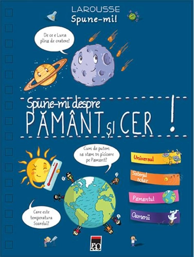 O enciclopedie frumos ilustrată cuprinzând răspunsurile la peste 200 de curiozități pe care le au copiii, structurate pe patru teme: Universul, Sistemul solar, Pământul, oamenii. Cine a fost Copernic, ce este o eclipsă, care este temperatura Soarelui, cine alege numele planetelor, cum poți deveni cosmonaut, ce vârstă are Pământul sunt doar câteva dintre întrebările la care micii curioși vor afla răspunsurile. Acestea sunt simple și concise și sunt însoțite de ilustrații amuzante. O carte indispensabilă pentru toţi copiii cărora le place să-şi ridice ochii spre cer şi să admire stelele! Alte titluri pentru Larousse (autor): 200 de alimente care ne vor binele (2015) , 30 de rețete delicioase cu Nutella (2015) , Prima enciclopedie Larousse (2015) , Animale domestice. Enciclopedia celor mici. Larousse (2015) , Grădina. Enciclopedia celor mici. Larousse (2015) , Creșterea bebelușului de la 0 la 3 ani. Larousse (2015) , Marea carte a invențiilor care ne-au schimbat viața (2015) , Primele mele descoperiri (2015) , Toate cunoştinţele necesare (5-6 ani). Pregătirea preşcolarului. Isteţ de mic! (autocolante) (2015) , Lindt Excellence 70% cacao (2016) ,