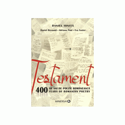 "Testament – 400 de ani de poezie romaneasca/Years of Romanian Poetry" este o antologie de poezie romaneasca de la 1650 pana in zilele noastre, un document absolut impresionant al valorii artistice de care a dat dovada neamul nostru romanesc si, nu in ultimul rand, o editie critica prin prisma informatiilor oferite de notele critico-biografice ale poetilor cuprinsi in volum. Insa dincolo de vasta colectie de 400 de ani de poezie romaneasca, realizatorul acestei antologii, Daniel Ionita, impreuna cu asistentii sai – prof. dr. Daniel Reynaud, Adriana Paul si Eva Foster –, a reusit, prin traducerea poeziilor, dar si a notelor critico-biografice, sa ofere cititorului de limba engleza posibilitatea accesului la poezia romaneasca si la valorosii ei poeti. Autor: Daniel Ionita (realizatorul antologiei si traducator principal) Asistenti: prof. dr. Daniel Reynaud, Adriana Paul, Eva Foster