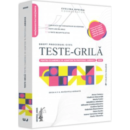 Care sunt avantajele lucrarii „Teste-grila pentru examenele de admitere in profesiile juridice. Drept procesual civil”? - ofera o imagine de ansamblu asupra problemelor de drept procesual civil ce pot constitui intrebari la toate concursurile/examenele pentru admiterea/definitivarea in magistratura si INM, avocatura, precum si in alte profesii juridice; - este adaptata cerintelor, exigentelor si nivelului ridicat de dificultate pe care le presupun concursurile si examenele specifice profesiilor juridice; - permite o evaluare corecta si completa a cunostintelor acumulate; - consolideaza notiunile juridice intr-o maniera structurata si adaptata conditiilor de examen; - antreneaza gandirea si logica si ajuta la realizarea de conexiuni intre diferitele institutii de drept procesual civil; - ajuta la intelegerea mecanismului de rezolvare a subiectelor tip grila, la formarea rationamentului logico-juridic specific, la intelegerea greselilor ce pot aparea in rezolvarea grilelor si la evitarea repetarii acestora; - contine grile cu una sau mai multe variante de raspuns corecte ori cu nicio varianta de raspuns corecta; - contine explicatii argumentate consistent pentru fiecare varianta de raspuns, indiferent ca este corecta sau gresita, cu trimiteri la textele de lege relevante; - este raportata la legislatia in vigoare, la deciziile Curtii Constitutionale, deciziile Inaltei Curti de Casatie si Justitie in recursuri in interesul legii si privind dezlegarea unor chestiuni de drept incidente in domeniul dreptului procesual civil; - contine trimiteri la opiniile doctrinare relevante; - este realizata de un colectiv de autori alcatuit din judecatori, avocati si cadre didactice cu o vasta experienta profesionala, practica si coordonata de un judecator si cadru didactic recunoscut in domeniul dreptului procesual civil; - asigura dobandirea succesului in cariera juridica visata; - au fost avute in vedere modificarile aduse prin Legea nr. 140/2022, Legea nr. 192/2022, Legea nr. 199/2022 si Legea nr. 220/2022.