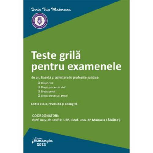 Cartea contine peste 1. 500 de teste grila din toate cele patru materii de studiu din care se dau atat examenele de licenta, cat si examenele sau concursurile de admitere in magistratura, avocatura sau notariat, adica: drept civil, drept procesual civil, drept penal, drept procesual penal. In cadrul fiecarei discipline, numarul grilelor este echilibrat pentru toate institutiile, urmarindu-se cu prioritate ca testele elaborate sa se suprapuna (cel putin partial) tematicii de licenta, pentru admiterea in Barou, la Institutul National al Magistraturii sau la Institutul Notarial Roman. Toate grilele incluse in aceasta editie beneficiaza de explicatii ale variantelor de raspuns, avand, in acelasi timp, marcat si nivelul de dificultate specific fiecarei grile. Au fost elaborate explicatii pentru toate variantele de raspuns, nu doar pentru cele corecte, pentru ca studentii sa inteleaga imediat si de ce o anumita varianta este gresita si sa gaseasca in cuprinsul acestei lucrari informatia cat mai completa, fara a mai fi nevoiti sa apeleze la alte 2-3 carti in acelasi timp. Toate explicatiile grilelor sunt insotite de o legenda care indica gradul de dificultate al fiecarei grile: (*) atunci cand grila are in vedere un singur text de lege; (**) atunci cand rezolvarea grilei presupune coroborarea a doua texte de lege; (***) atunci cand rezolvarea grilei presupune coroborarea a trei sau mai multe texte de lege; (!) atunci cand nivelul de dificultate al grilei este unul ridicat; (D) atunci cand, pentru rezolvarea ei, este necesara parcurgerea doctrinei de specialitate, a RIL-urilor, HP-urilor etc.; (S) atunci cand grila este formulata sub forma unei spete. Dupa grilele asezate pe materii, in partea finala a cartii au fost elaborate si doua teste recapitulative, cu grile de nivel mediu spre dificil, similare celor de la admiterile in profesie, fiecare test incluzand 100 de intrebari (cate 25 pentru fiecare disciplina de examen). Toate testele din editia a 8-a au fost revizuite si actualizate in acord cu tematica actuala de admitere in profesiile juridice, incluzand modificarile legislative la zi – cele mai importante fiind modificarile aduse prin Legea nr. 140/2022 privind unele masuri de ocrotire pentru persoanele cu dizabilitati intelectuale si psihosociale.