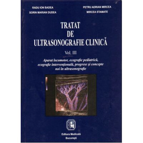 Volumul trei al tratatului de ultrasonografie aduce cateva capitole de fond care intregesc ansamblul inceput cu primul volum si continuat cu cel de-al doilea. Astfel, un spatiu larg este dedicat ecografiei aparatului locomotor, teritoriu cu nenumarate aplicatii clinice, urmat de ecografia pediatrica, tinand cont de particularitatile distincte ale varstei subiectilor investigati si patologiei lor specifice, si, nu in ultimul rand, aceasta lucrare este prima care include un capitol dedicat ultrasonografiei interventionale, scris exclusiv ca rod al experientei autorilor. In final, o parte distincta este dedicata progreselor si conceptelor noi dezvoltate in ultrasonografie, metoda ale carei aplicatii in domeniul interventionalului diagnostic si mai ales terapeutic pur si simplu au explodat, devenind din ce in ce mai complexe prin adaugarea unor posibilitati tehnice noi, valoarea sa practica fiind exceptionala. Cuprins: I. Ecografia aparatului locomotor si a tesuturilor moi superficiale: Sistemul musculoscheletal. Tegumentul si tesutul celular subcutanat. Regiunea inghinala. Regiunea poplitee. II. Ecografia pediatrica: Creierul nou-nascutului si sugarului. Fata si gâtulu. Toracele. Ficatul, caile biliare si splina. Tractul gastrointestinal. Pancreasul, glandele suprarenale si alte structuri retroperitoneale. Aparatul urinar. Pelvisul pediatric. Scrotul. Articulatia coxo-femurala la nou-nascut si sugar. III. Ecografia interventionala: Date generale. Ultrasonografia cu scop diagnostic. Ultrasonografia cu scop terapeutic. Ultrasonografia intraoperatorie. Ultrasonografia laparoscopica. IV. Progrese si concepte noi in ultrasonografie: Tehnologii noi si inovatii in diagnosticul cu ultrasunete. Ecografia endocavitara. Agentii de contrast. Explorarea ecografica tridimensionala. Elastografia ultrasonora. Elastografia unidimensionala tranzitorie. Explorarea ecografica in evaluarea urgentelor vitale si a starilor critice. Tehnica FAST. Ecografia in sindromul imunodeficientei dobândite. Solutii de telemedicina si e-health aplicate in ultrasonografie. Anexa: Valori normale. Adresabilitate: Medici specialisti in ecografie, internisti, pediatri, chirurgi, medici de alte specialitati, rezidenti. Autori: Radu I. Badea, Sorin M. Dudea, Petru A. Mircea, Mircea Stamate