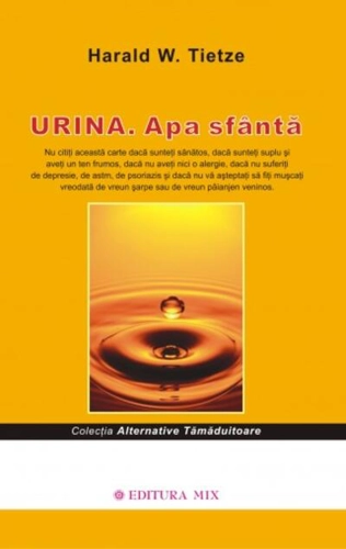 Urina conține substanțe minerale, aminoacizi, enzime, hormoni, și așa mai departe, dar și antidoturi specifice, esențiale pentru starea dumneavoastră de bine. Puțini oameni sunt dispuși să vorbească deschis despre un subiect ca terapia prin urină. Singurele persoane dispuse să vorbeasca în public despre ea sunt cele care s-au vindecat miraculos prin urinoterapie și care doresc să își împărtășească această cunoaștere cu semenii lor. Urina conține substanțe minerale, aminoacizi, enzime, hormoni etc., dar și antidoturi specifice, esențiale pentru starea dumneavoastră de bine. Dacă ar trebui să cumpere cele peste 2.500 de ingrediente care pot fi extrase din urină, majoritatea a oamenilor nu și le-ar putea permite din punct de vedere financiar. Cartea pe care v-o oferim este traducerea celei de-a treia ediții a lucrării „Urina. Apa sfântă” și conține multe informații referitoare la acest remediu miraculos, informații ce au fost dezbătute în cadrul celei de-a treia Conferințe Mondiale de Urinoterapie, care a avut loc în Brazilia. „Terapia prin urină este extrem de eficientă. Mulți o consideră chiar cea mai eficientă dintre toate terapiile accesibile omului. Cea mai mare problemă a ei este legată de faptul că este disponibilă tuturor și la orice oră, că este gratuită și nu are efecte secundare. De ce? Când ceva este gratuit și stă la dispoziția tuturor, nimeni nu îi face reclamă, cel puțin în țările occidentale. În țările bogate, educația costă bani, iar dacă nu ai ceva de vânzare, nimeni nu este interesat să facă reclamă unei modalități gratuite de vindecare.” „Puțini oameni sunt dispuși să vorbească deschis despre un subiect ca terapia prin urină. Singurele persoane dispuse să vorbească în public despre ea sunt cele care s-au vindecat miraculos prin urinoterapie și care doresc să împărtășească această cunoaștere semenilor lor. În țările occidentale, urinoterapia nu este folosită de regulă decât ca o ultimă șansă de vindecare, atunci când toate celelalte metode de tratament au fost încercate fără succes.” Alte titluri pentru HaraldTietze (autor): Întinerirea (2023) , Kombucha - Ciuperca miraculoasă (2023) , Kombucha. Plante medicinale care pot fi folosite pentru ceaiul de Kombucha (2023) , Știința Fericirii (2023) , Manual de radiestezie (2023) , Alte titluri pentru CristianHanu (traducator): Zenisme (2023) , Cele zece Mahavidya (2023) , Iniţierea (2023) , Cartea despre copii (2023) , Omul care iubea pescăruşii (2023) ,