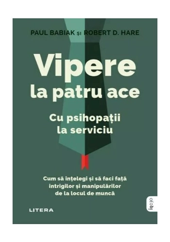 Sa spunem ca esti pe cale sa angajezi pe cineva in compania la care lucrezi. Corporatia isi doreste o persoana increzatoare, carismatica si plina de idei noi. Candidatul X este sarmant, destept si da numai raspunsuri corecte la toate intrebarile tale. Problema rezolvata, nu-i asa? Poate ca nu. Ne place sa credem ca, daca am intalni o persoana care nu are nici urma de constiinta – care ar fi capabila sa nu faca nimic daca acest lucru i-ar servi intereselor –, am recunoaste-o ca atare. In cultura populara, imaginea unui psihopat se suprapune peste cea a lui Hannibal Lecter. Dar, in realitate, multi psihopati nu isi doresc decat bani, putere, faima sau, pur si simplu, o masina frumoasa. Unde se duc acesti psihopati? Adesea in lumea corporatiilor. Cercetatorii Paul Babiak si Robert Hare studiaza de multa vreme psihopatii. Hare, autorul cartii Without Conscience, este expert de renume mondial in psihopatii, iar Babiak este psiholog industrial-organizational. Recent, cei doi au inceput sa studieze impreuna modul in care opereaza psihopatii in corporatii, iar rezultatele au fost surprinzatoare. Au descoperit ca tocmai lumea moderna, deschisa si mai flexibila a firmelor mari, in care riscurile ridicate pot aduce profituri pe masura, este cea care atrage psihopatii. Acestia isi pot face intrarea ca stele in ascensiune si salvatori ai companiei, dar nu va trece mult timp pana ce vor incepe sa abuzeze de colegi, sa isi manipuleze supervizorii si vor parasi locul de munca lasand totul in haos. Vipere la patru ace arunca o privire fascinanta, infricosatoare si stiintific exacta asupra modului in care functioneaza psihopatii la locul de munca: ce fel de companii ii atrag, cum isi negociaza procesul de angajare si cum functioneaza zi de zi. Veti afla cum isi aplica tehnicile de manipulare „instinctive” – evaluandu-si tintele potentiale, controlandu-si victimele influente si abandonandu-i pe cei care nu le mai sunt utili – in procesele de afaceri precum angajarea, comanda si controlul politic si succesiunea in pozitiile de conducere, ascunzandu-se in tot acest timp in hainele culturii corporatiste. Este o lectura obligatorie pentru toti cei din lumea afacerilor, pentru ca, indiferent la ce nivel te afli, vei afla care sunt semnalele subtile de alarma ale comportamentului psihopat si vei putea sa te protejezi pe tine si compania – inainte de a fi prea tarziu. „[Psihopatii] au fost prezenti mereu in consiliile de conducere ale firmelor. Acum avem la indemana manualul de baza, destinat a deveni clasic, de intelegere a acestui «pradator intraspecie».“ Dr. J. Reid Meloy, psiholog criminalist si autor al cartii The Psychopathic Mind „Un indrumar fascinant despre cum sa te feresti de psihopatii peste care dai la locul de munca.“ Winnipeg Free Press Dr. PAUL BABIAK este psiholog industrial si organizational din New York si presedintele HRBackOffice, o firma de consultanta si coaching executiv, specializata in a-i ajuta pe manageri sa identifice posibilii psihopati care se ascund in organizatiile lor. El si colaboratorii lui au condus unele dintre cele mai importante studii avand ca subiect psihopatii din mediul corporatist. Activitatea sa a fost prezentata in ziare, in reviste de afaceri si in documentare si a fost invitat la numeroase emisiuni de radio si de televiziune. Printre clientii sai s-au numarat directori din lumea afacerilor, din cea academica, din institutiile de forta, guvern, asigurari, medicina, marketing, finante si servicii secrete. Este invitat constant la conferinte si la intalniri de afaceri. Paul este vicepresedinte al Aftermath: Surviving Psychopathy Foundation, o organizatie nonprofit care ofera informatii si sprijin pentru victimele psihopatiei. Dr. ROBERT D. HARE este autorul cartii Without Conscience si creatorul instrumentului standard de diagnosticare a psihopatiei. Este profesor emerit de psihologie la University of British Columbia si presedinte al Darkstone Research Group, o firma de cercetare si consultanta in criminalistica. A castigat numeroase premii pentru studiile sale, tine conferinte in toata lumea avand ca subiect psihopatia si este consultant al organizatiilor de aplicare a legii, inclusiv FBI. Locuieste in Vancouver, British Columbia, cu sotia sa.