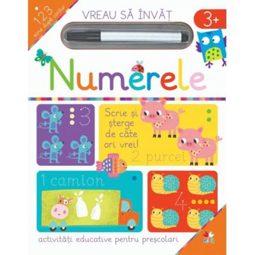 Prin activitatile din aceasta carte perfecta pentru varsta prescolara, cei mici vor putea: • sa identifice si sa scrie dupa contur numerele de la 1 la 20; • sa invete ordinea numerelor; • sa-si dezvolte coordonarea mana-ochi; • sa se pregateasca pentru scris; • sa recunoasca imagini si numere; • sa invete sa tina stiloul corect. Paginile cartii iti permit sa scrii si stergi ori de cate ori doresti. Sterge scrisul cu un servetel sau cu o carpa.